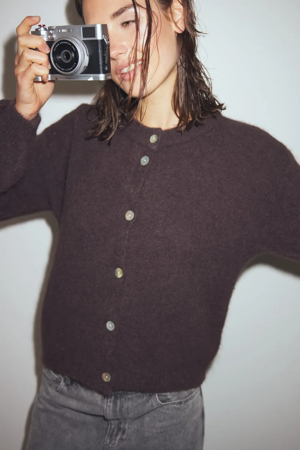 Strikket cardigan fra Noella i chokoladebrun. Den har en løs pasform med rund hals, knapper foran og voluminøse ærmer. Perledetaljer giver cardiganen et diskret pift.