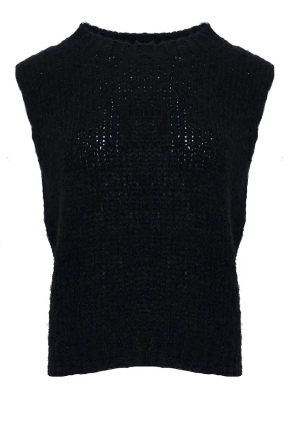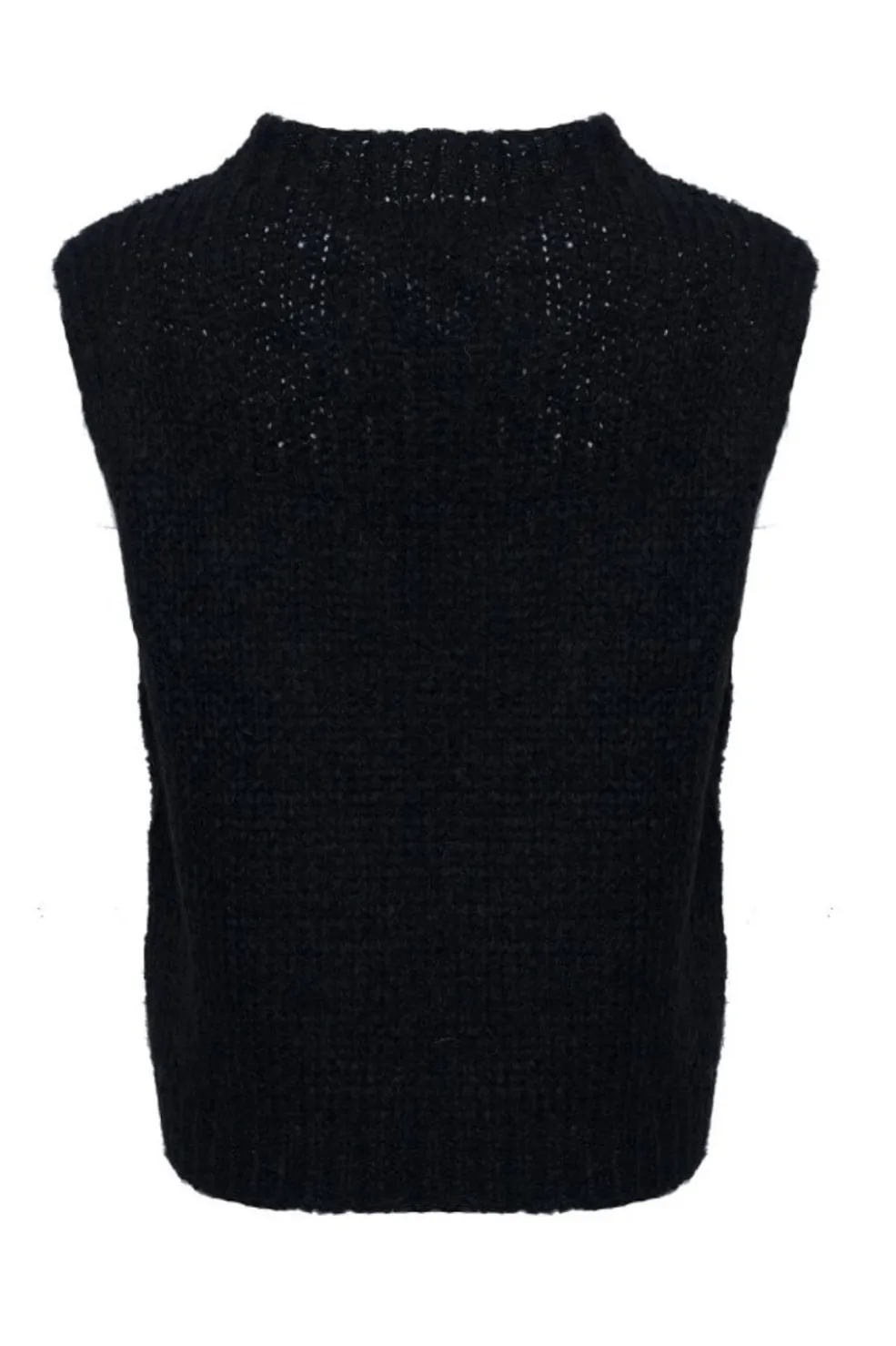 Sort strikket vest fra Noella med høj hals og ribkant. Den ærmeløse vest har en strikket tekstur og chunky look med ribkant i bunden.