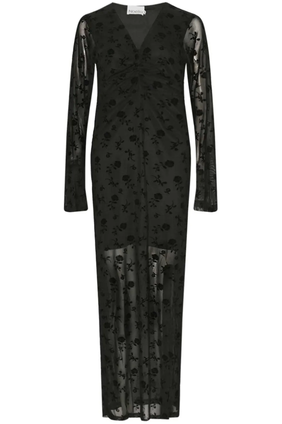 Sort kjole fra Noella med blomsterprint i sorte og lilla nuancer. Kjolen har v-udskæring, lange ærmer, flæser og lang længde.