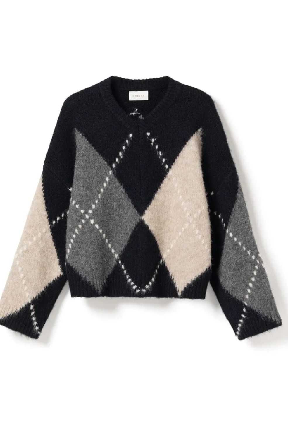 Striktrøje fra Noella med store diamantformede mønstre i mørkeblå, grå og beige. Den har V-hals og lange ærmer med en løs pasform.