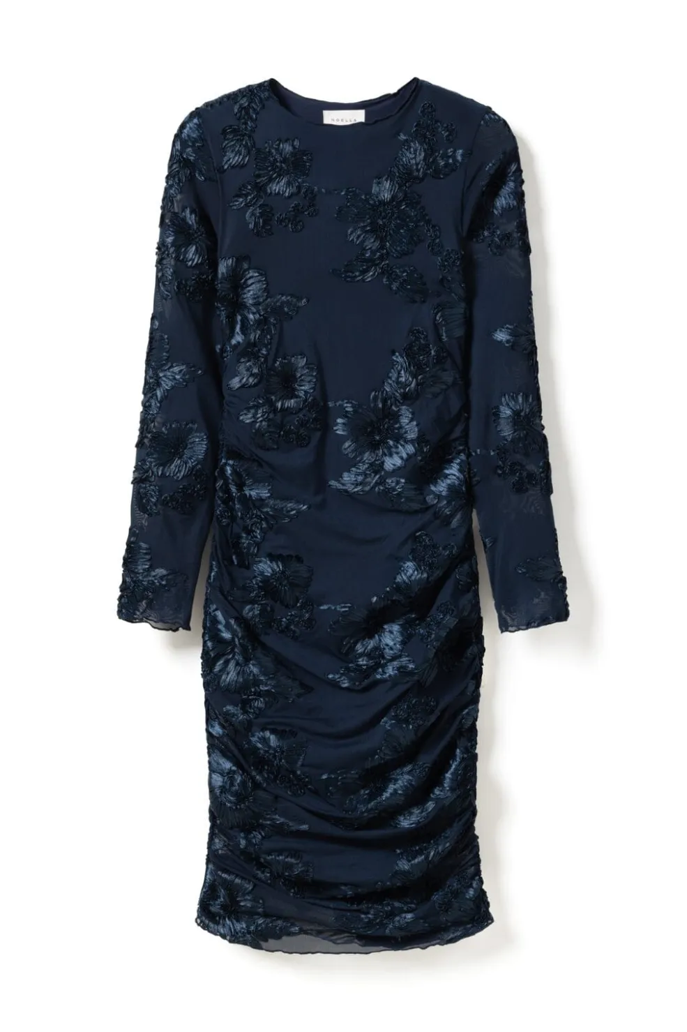Mørkeblå kjole fra Noella med 3D-blomstermønster. Kjolen har en kropsnær pasform og lange ærmer. Strækbart meshstof med broderi og flæser giver kjolen et særpræget udtryk.