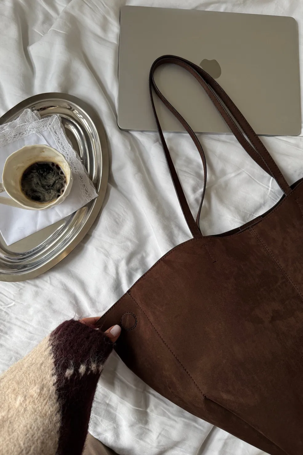 Stor taske fra Noella i kaffebrun med ruskindslignende overflade. Tasken har lange hanke til skulderen og en rummelig inderside med plads til både computer og hverdagens nødvendigheder.