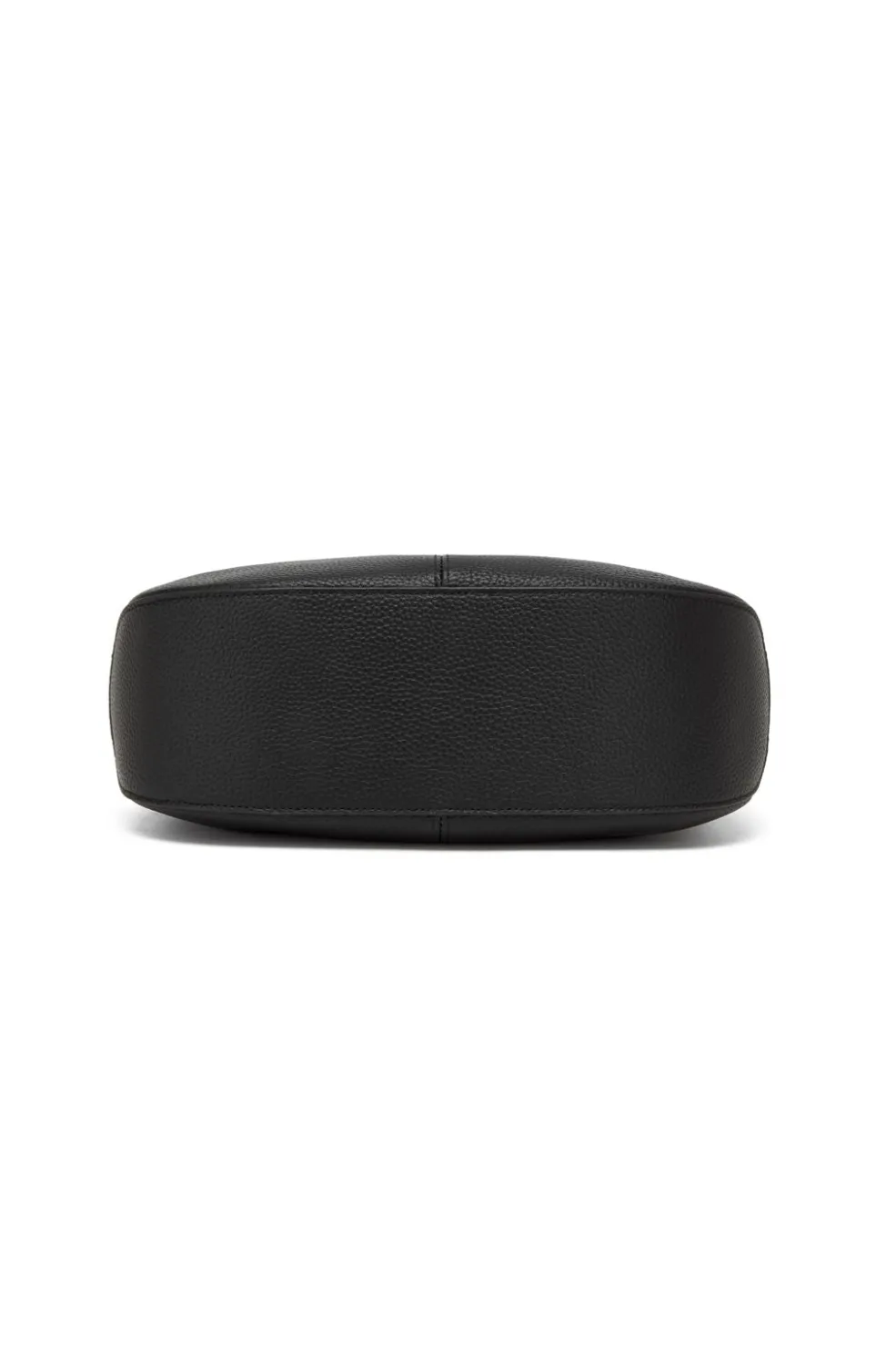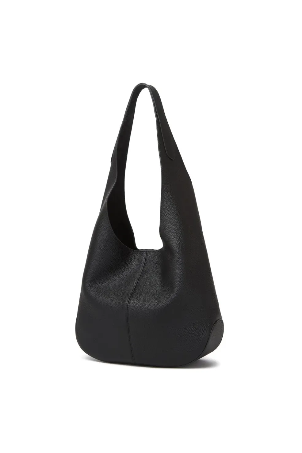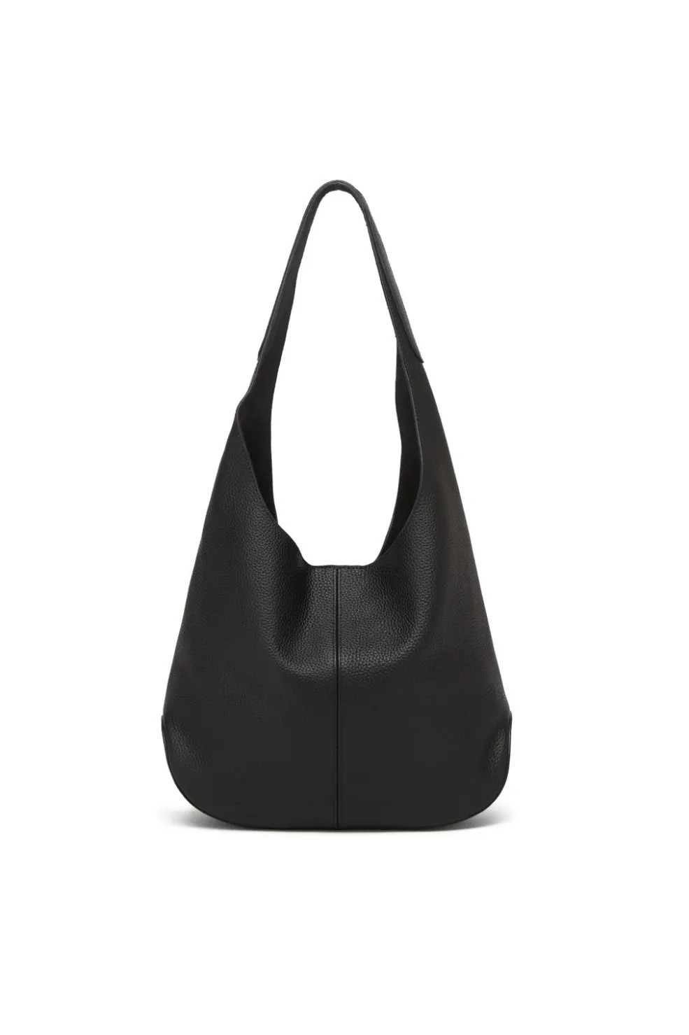 Sort skuldertaske fra Noella, lavet i ægte læder med en let småstenet overflade. Tasken har en enkelt rem og en rund bund.
