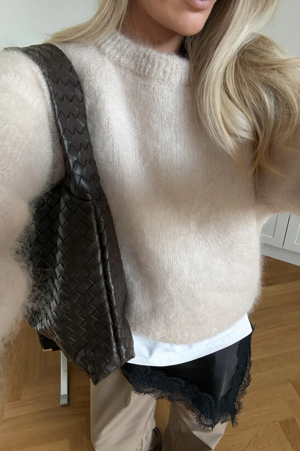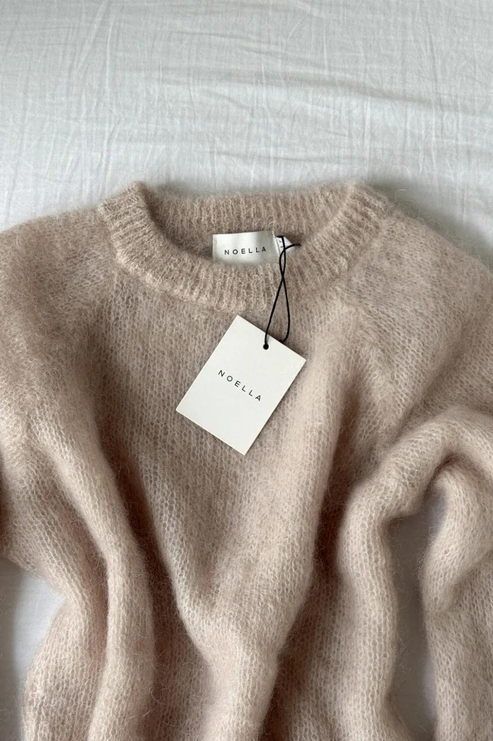 En strikbluse fra Noella i en lys beige farve. Blusen har en blød, fluffy tekstur og en rund halsudskæring med lange ærmer.