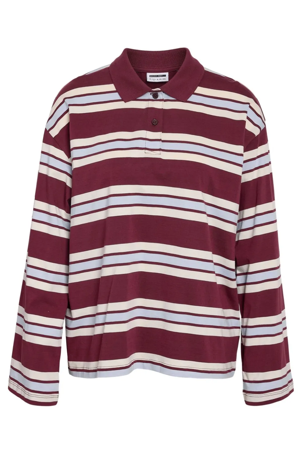 Stribet polo-shirt fra Noisy May med vandrette striber i vinrød, lyseblå og beige. Poloen har en polo-krave med knaplukning og lange ærmer.