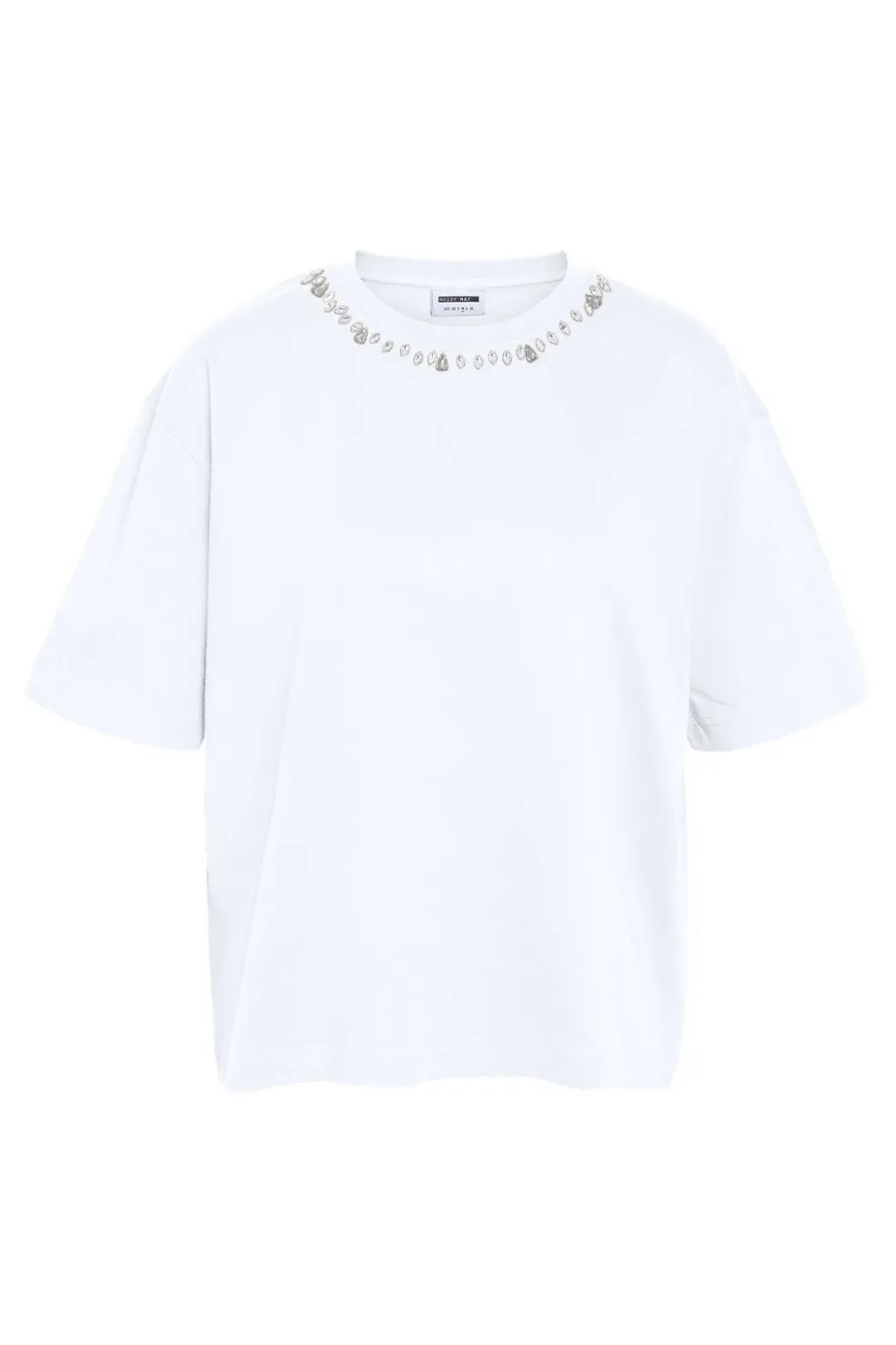 Hvid t-shirt fra Noisy May med rhinsten omkring halsen. T-shirten har korte ærmer og en afslappet pasform.