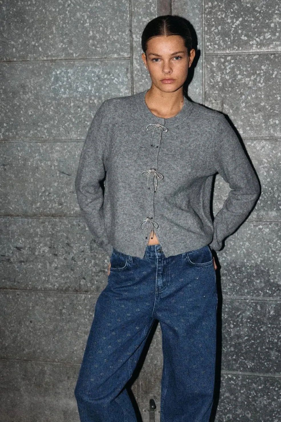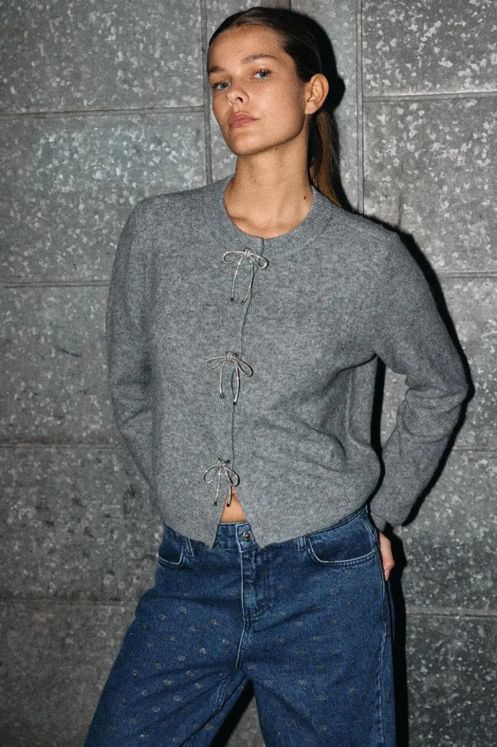 Grå strikket cardigan fra Noisy May med dekorative sløjfer og pailletter langs fronten. Cardiganen har lange ærmer og en rund halsudskæring.