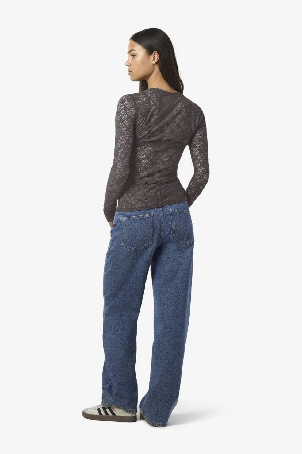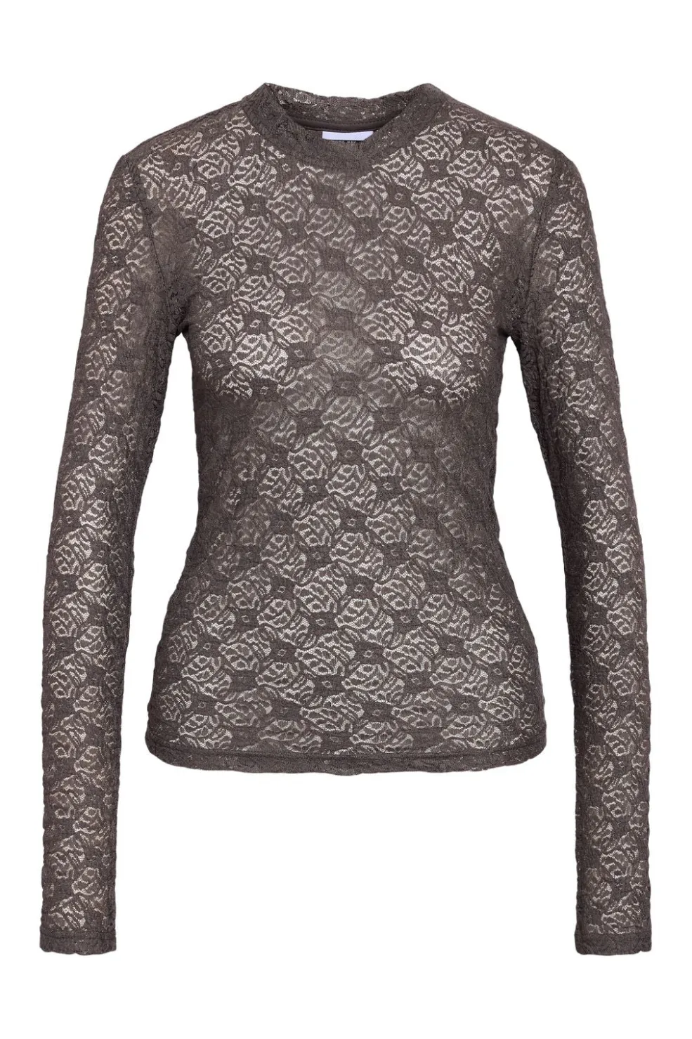 En blondetop fra Noisy May i mørkegrå. Toppen har lange ærmer og en tætsiddende pasform med gennemsigtige blonder.