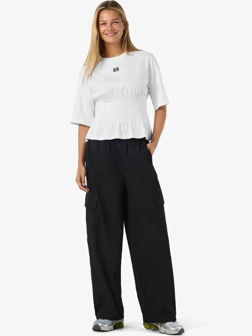 Fitted t-shirt fra Noisy May i hvid med Nm-logo. T-shirten er lavet af 100 % økologisk bomuld og har dekorative syninger og flæser.