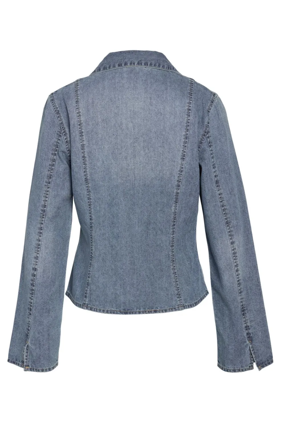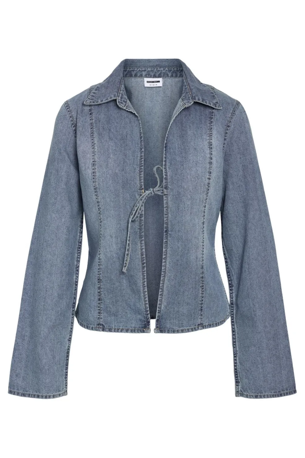 Denimskjorte fra Noisy May i lys blå denim. Skjorten har dekorative syninger og sløjfer samt en snor til lukning foran.