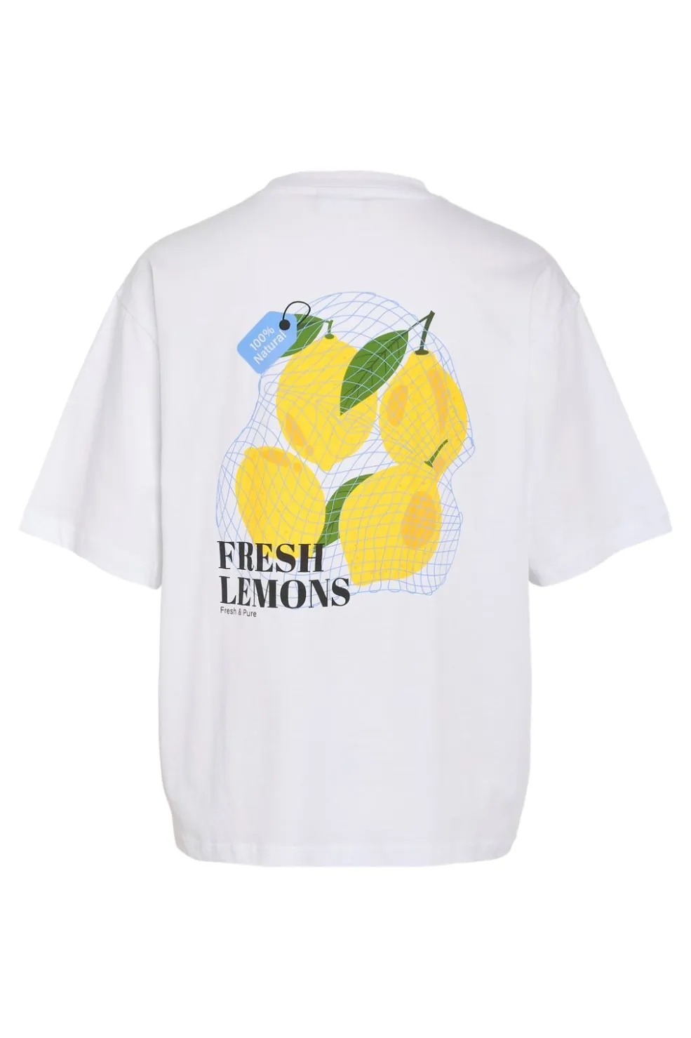 Hvid t-shirt fra Noisy May med citrongrafik. En lille broderet citron foran på brystet og en større grafik bagpå med flere citroner i net.