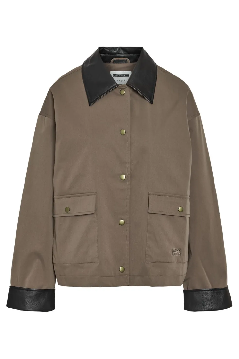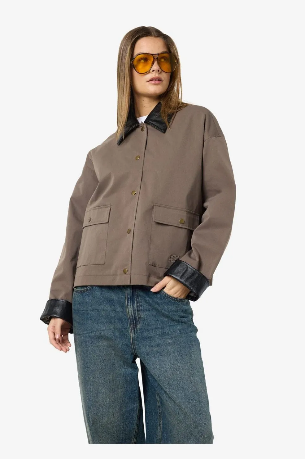 Jakke fra Noisy May i brun polyester med sort PU-krave og detaljer på ærmerne. Jakken har en oversized pasform og er fuldt foret.