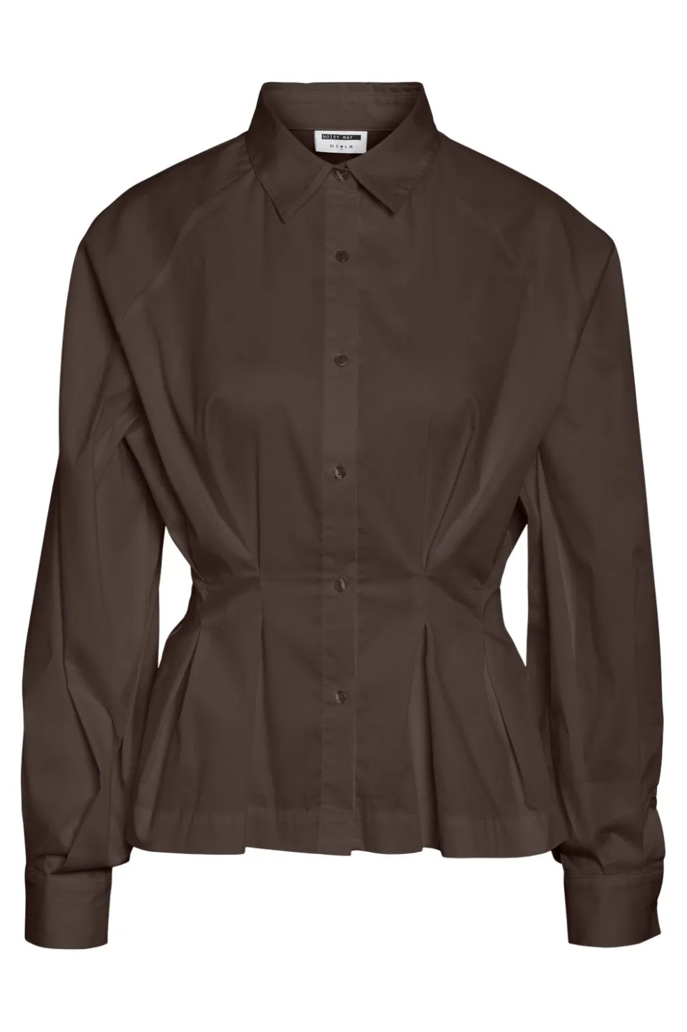 Chokoladebrun skjorte fra Noisy May med lange ærmer og slim fit. Skjorten har en klassisk krave og dekorative syninger, der giver den et diskret og gennemført udtryk.