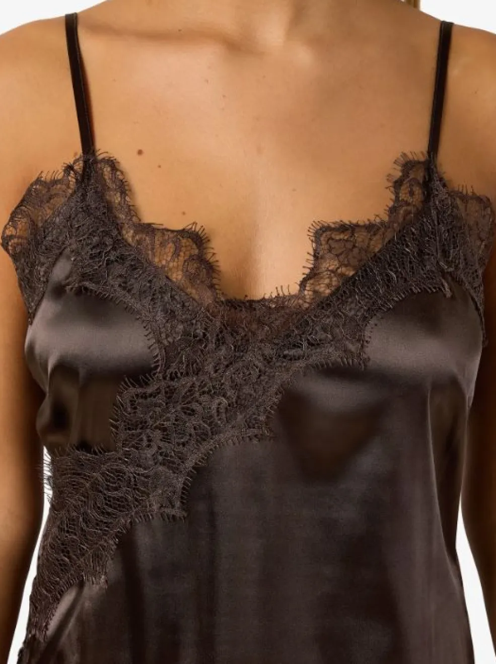 Satinkjole fra Noisy May i chokoladebrun. Kjolen er lavet af 100 % polyester med en skinnende overflade og blondedetaljer ved V-halsudskæringen.