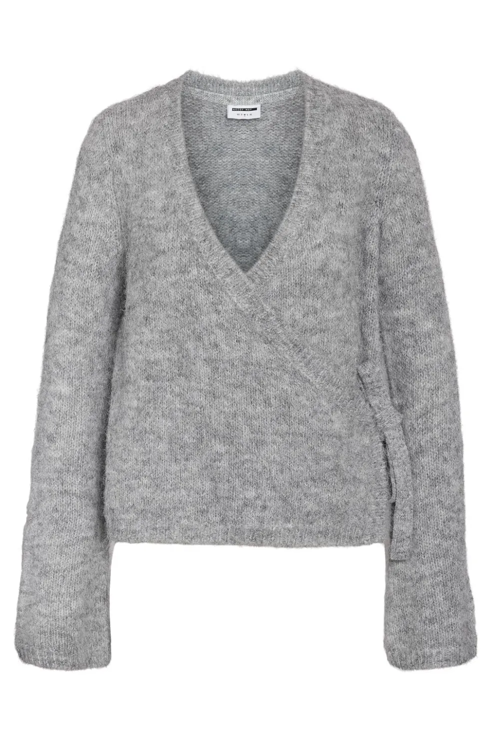 Strikket wrap-top fra Noisy May i lysegrå meleret farve med slå-om-design og V-udskæring. Toppen har lange ærmer og bindebåndsdetaljer.