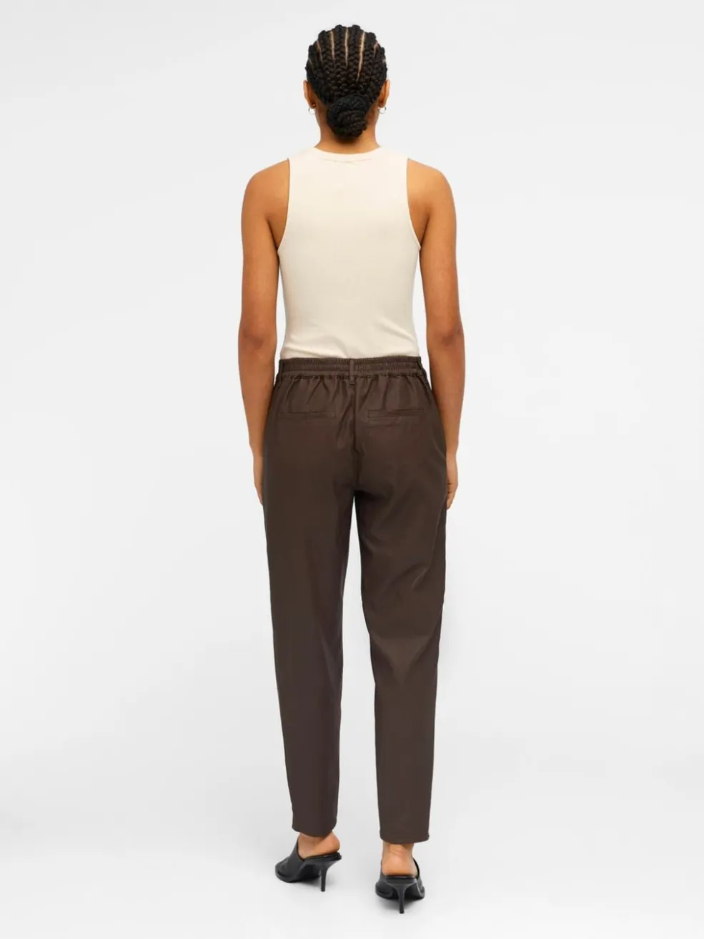 Brune bukser fra Object med coated overflade i Java-farven. Bukserne har en løs pasform og elastik i taljen. Sidelommerne i fronten giver bukserne et praktisk præg.