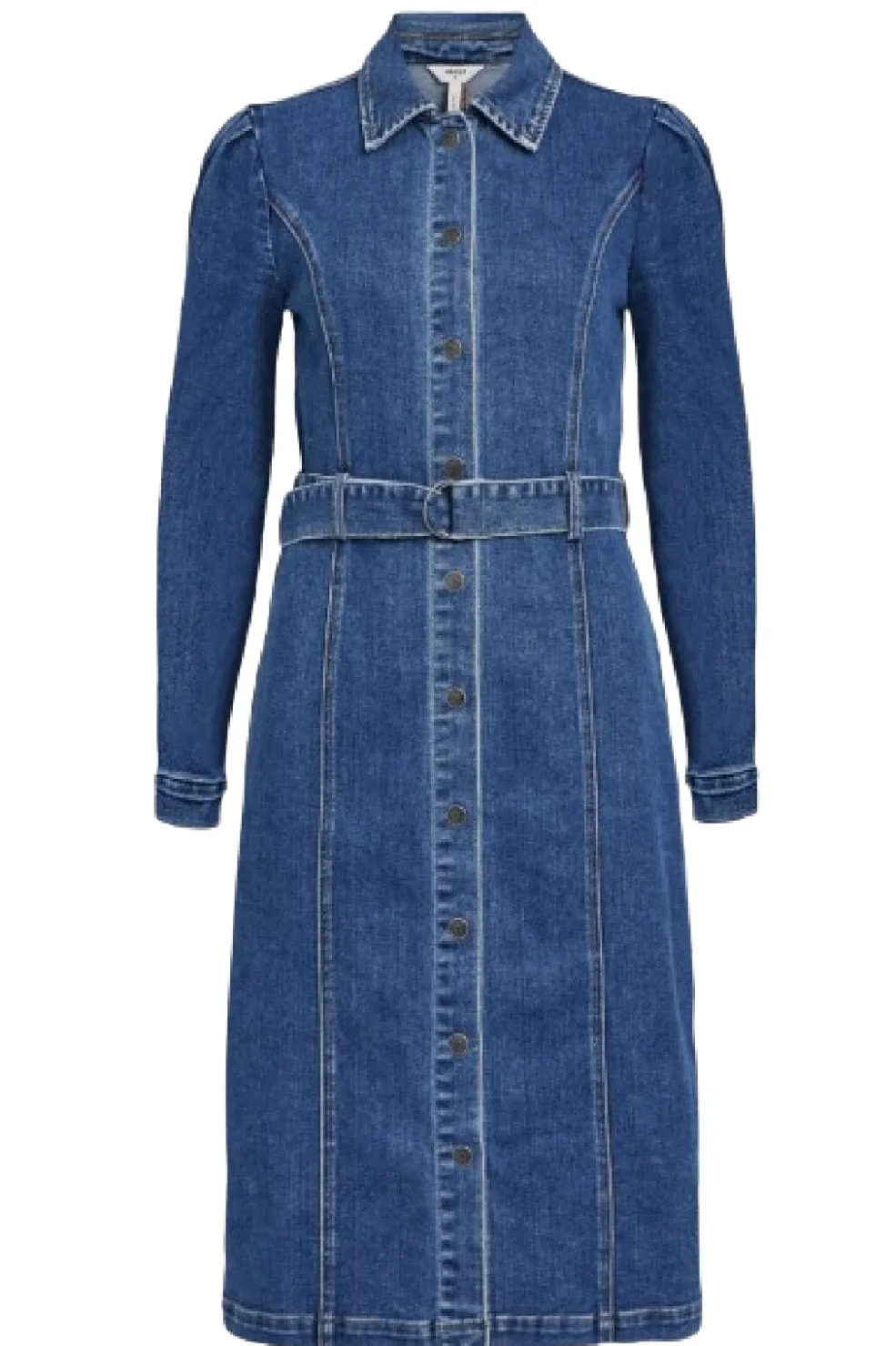 Denimkjole fra Object med skjortekrave og knaplukning foran. Den blå kjole har lange ærmer og bælte i taljen. Kontrastfarvet syning fremhæver kjolens design.