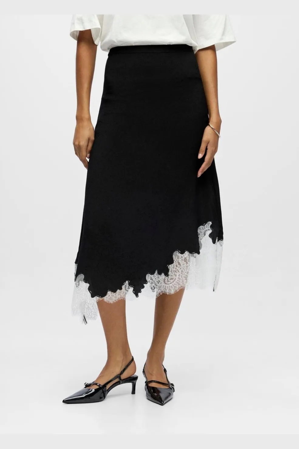 Lang nederdel fra Object i sort med hvid blondekant nederst. Nederdelen har et A-formet snit og går til midt på læggen.
