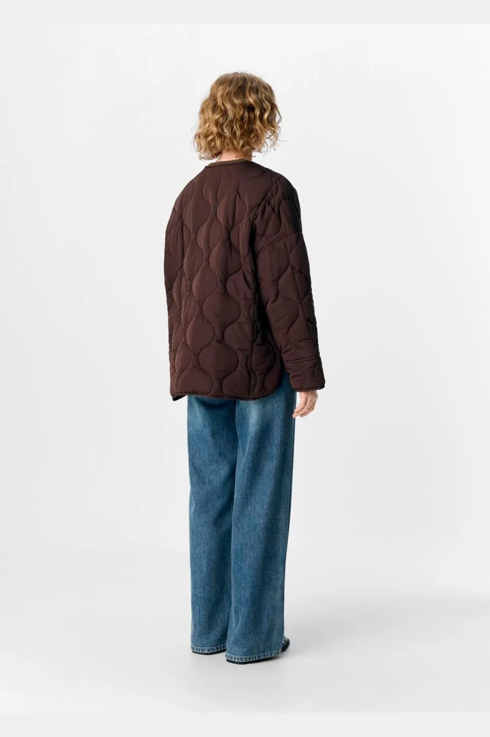Brun quiltet jakke fra Object med rund hals og lange ærmer. Den har knaplukning foran og praktiske forlommer. Jakken er fremstillet af vatteret stof med et gennemgående syet mønster.