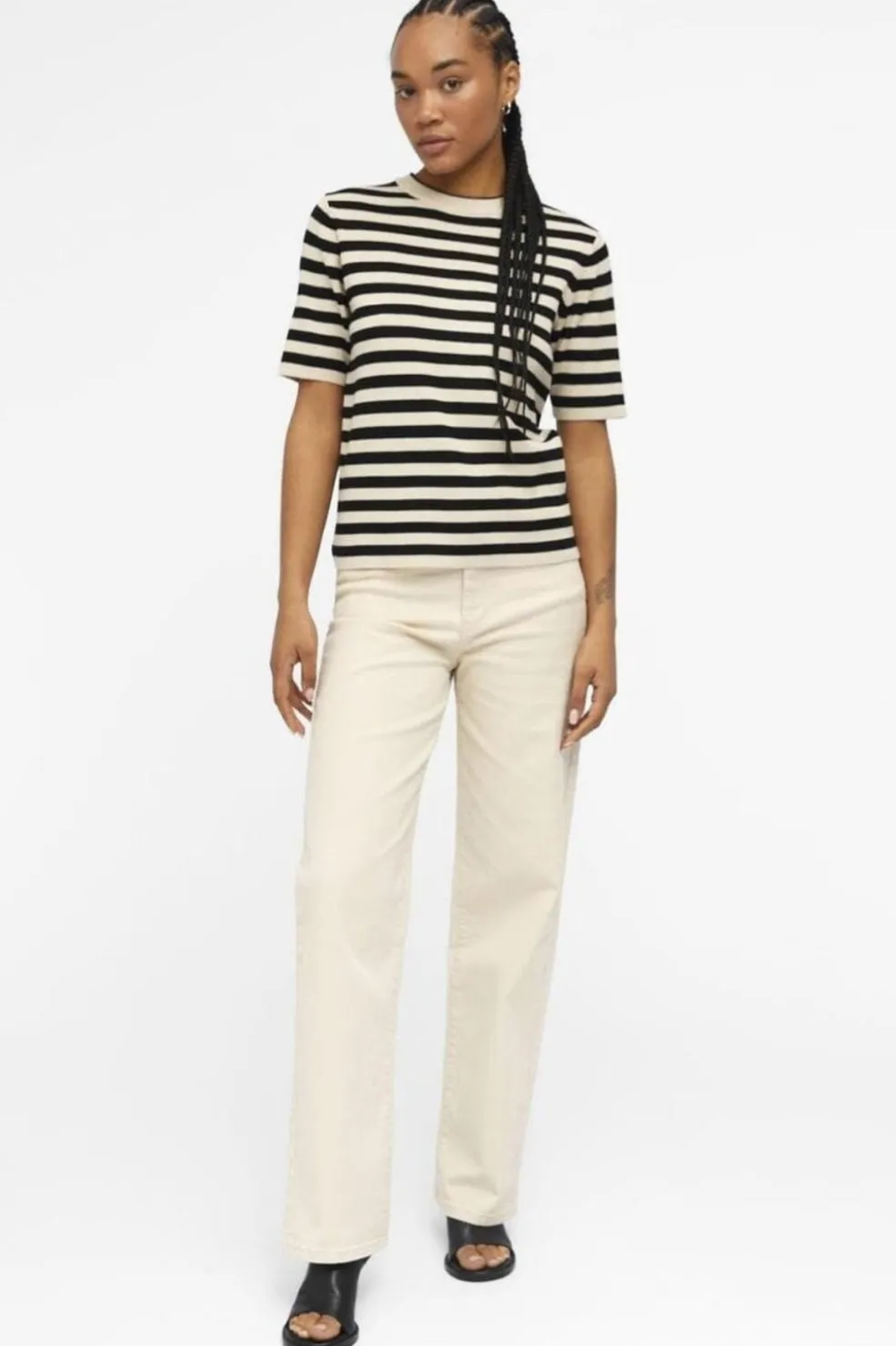 Striktrøje fra Object med korte ærmer i netmønstret strik. Den har striber i sandfarvet og sort, rund hals og en regular pasform. Strikken har en naturlig stræk i materialet.
