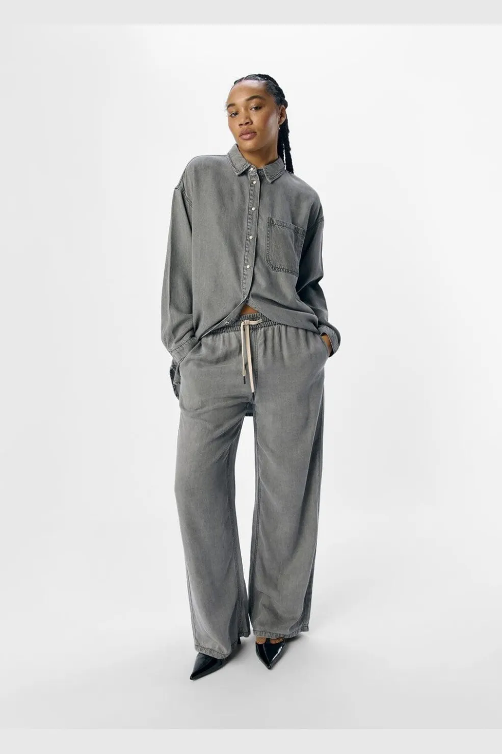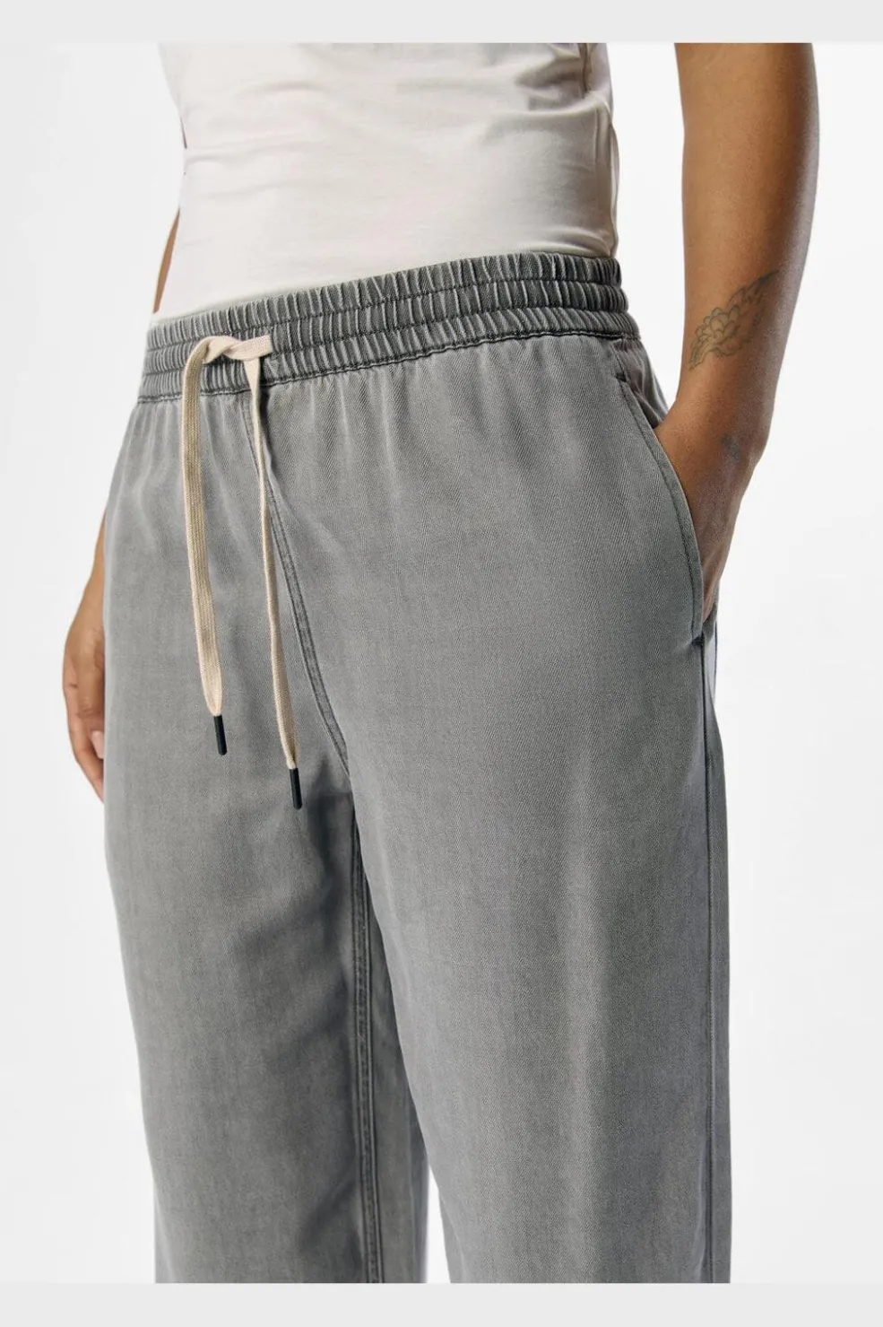 Lysegrå bukser fra Object i Lyocell-denim. Bukserne har en løs pasform og gulvlængde med bindebånd i taljen. De er fremstillet i et blødt og åndbart materiale.
