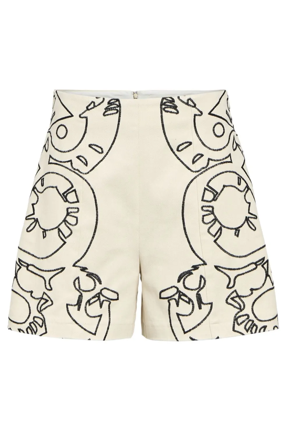 Lyse beige shorts fra Object med sorte broderier. De har en høj talje og et løst wide leg fit. Shortsene lukkes med lynlås og har et kunstnerisk broderet mønster på forsiden.