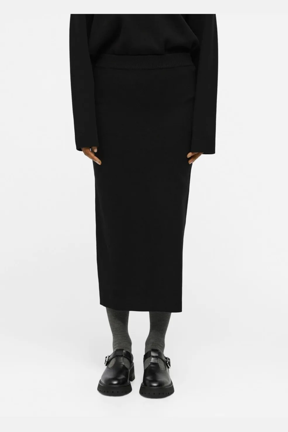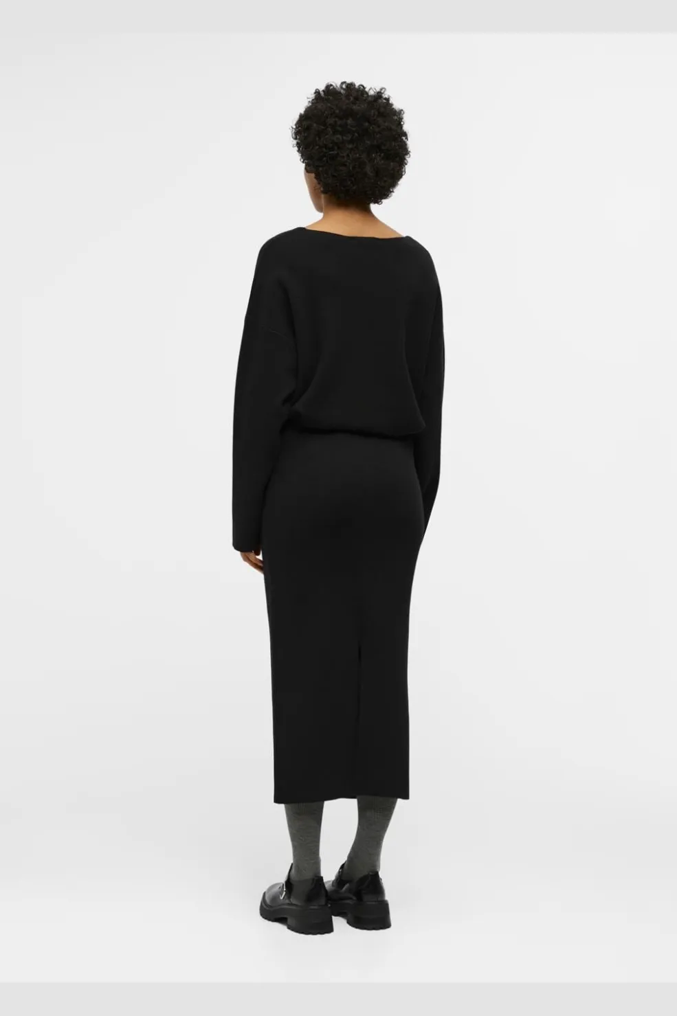 Sort striknederdel fra Object med høj talje og ankelængde. Nederdelen har en elastisk linning og er fremstillet i et blødt strikket materiale med garnløkker.