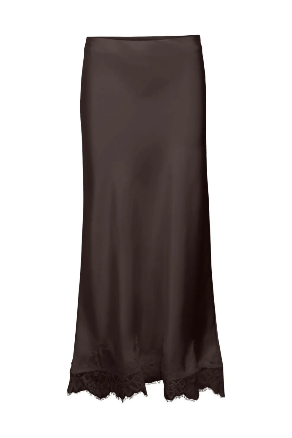Lang nederdel fra Object i mørkebrun farve. Nederdelen har en glat overflade og en dekorativ blondekant forneden, der giver et fint touch til designet.