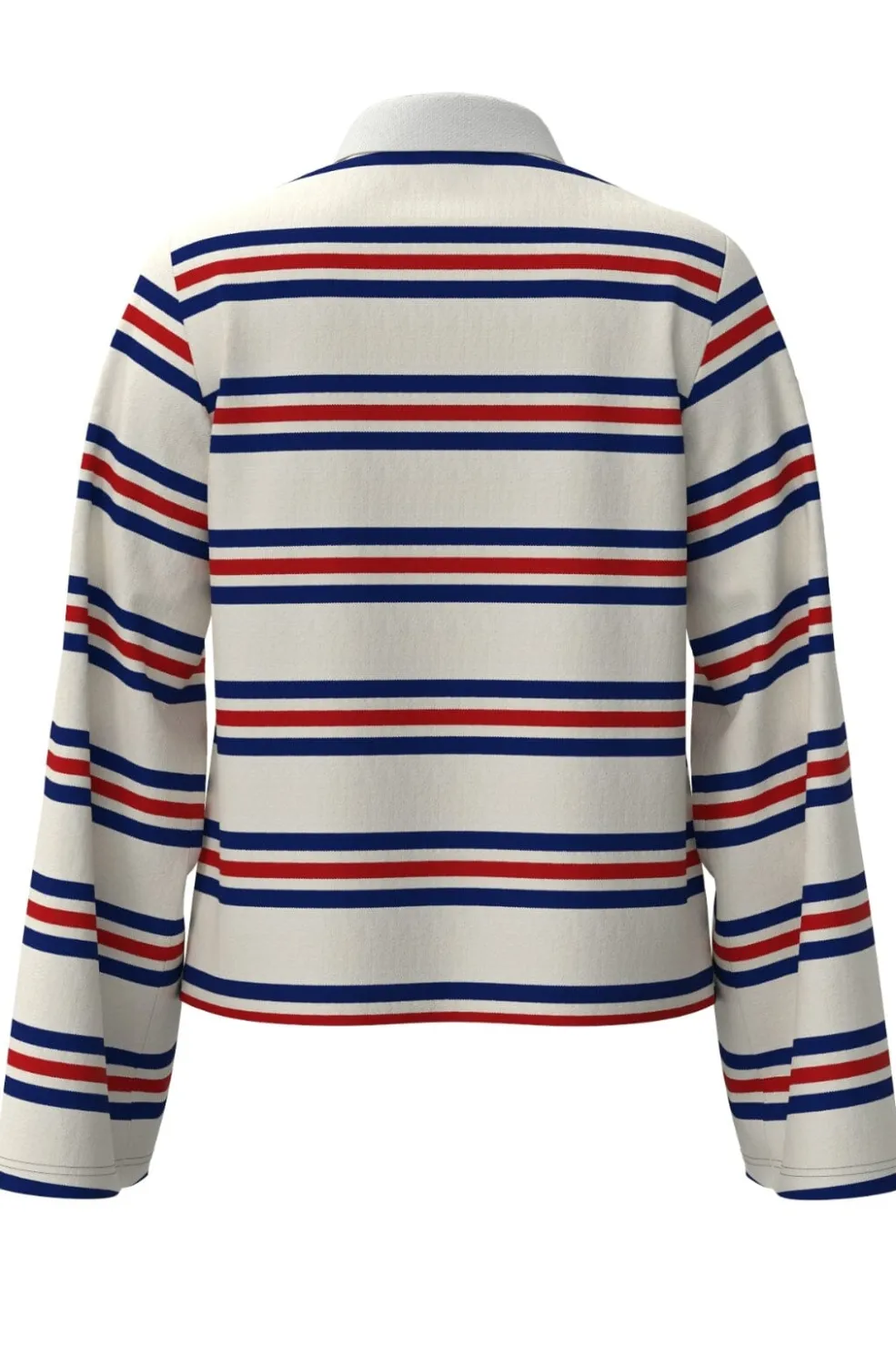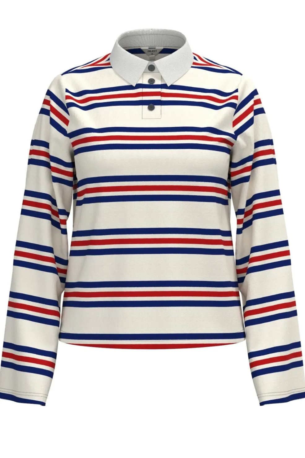 Langærmet polo-top fra Object med striber i blå og rød på hvid bund. Toppen har en polokrave og knapper foran samt en regular pasform, der giver god bevægelsesfrihed.