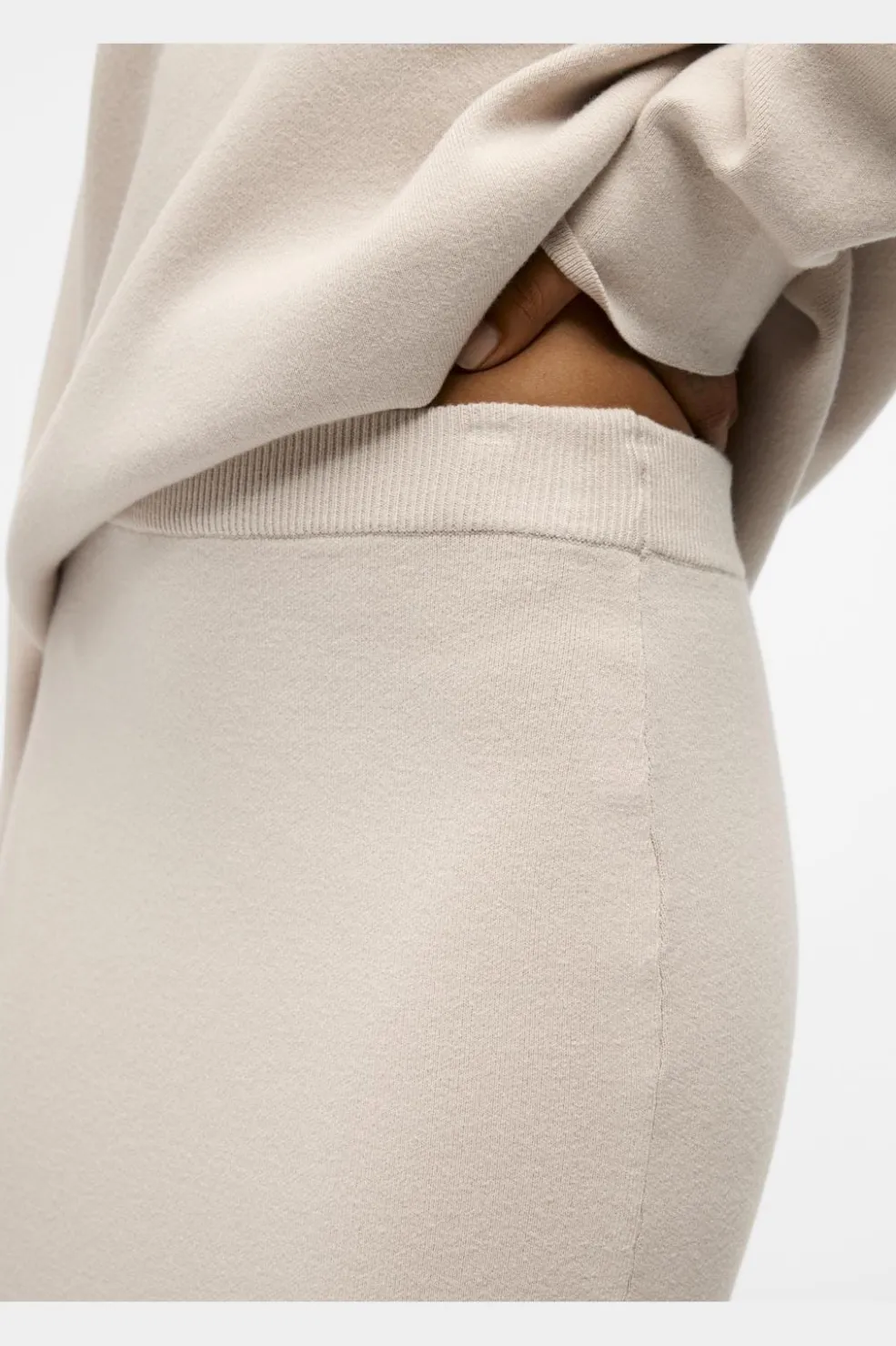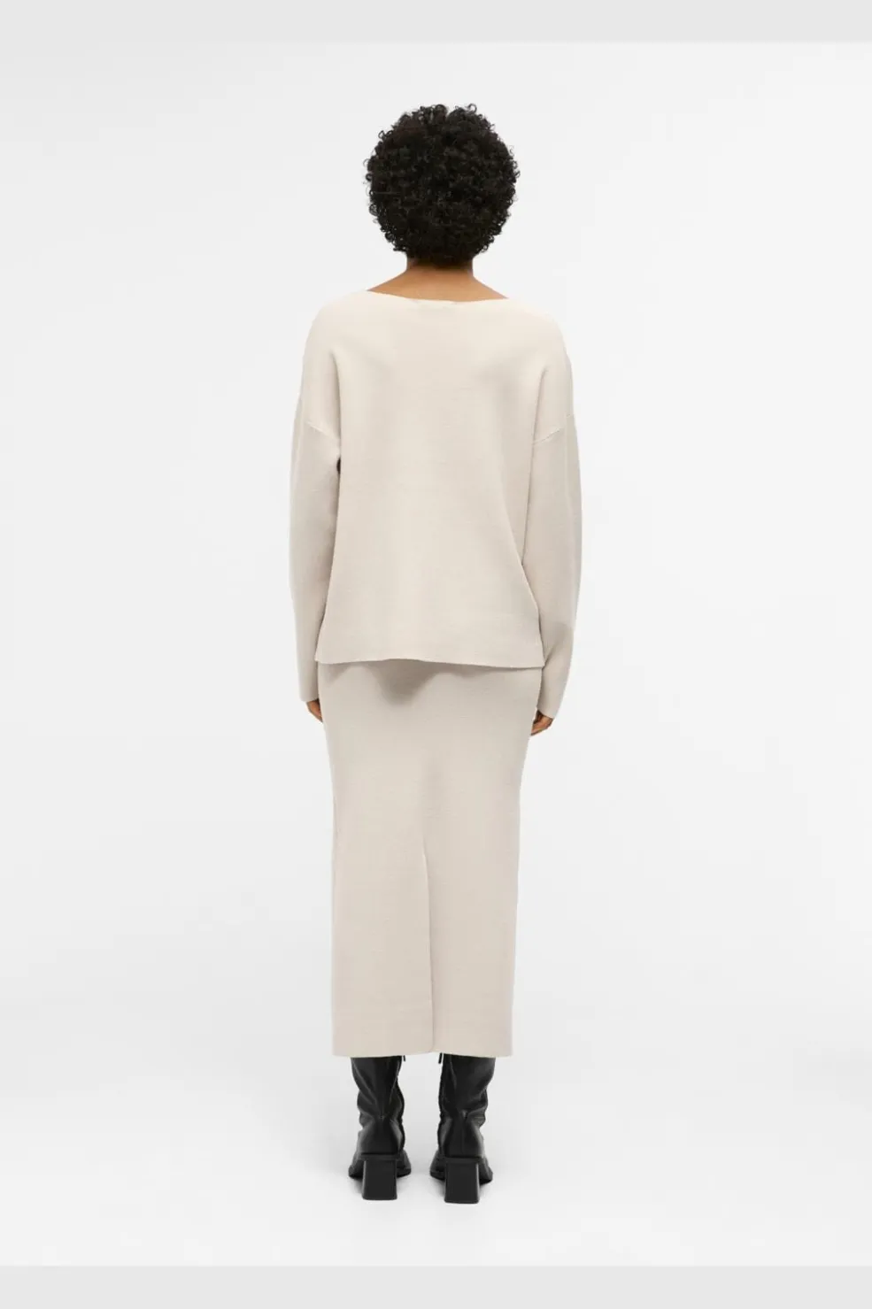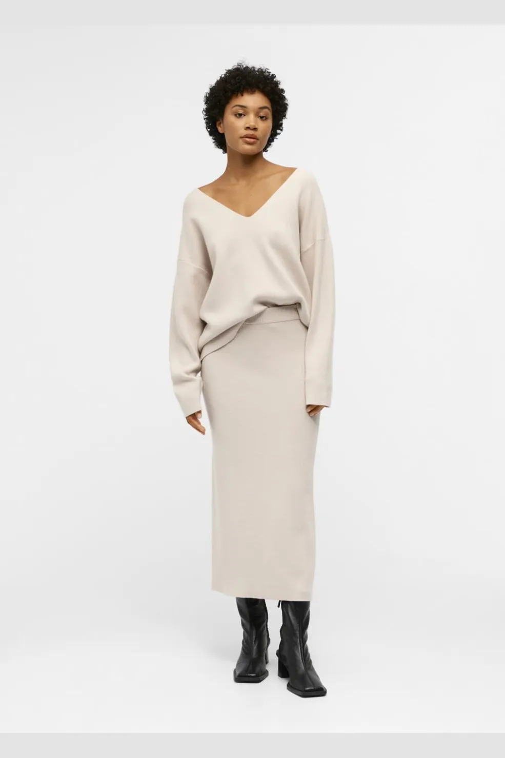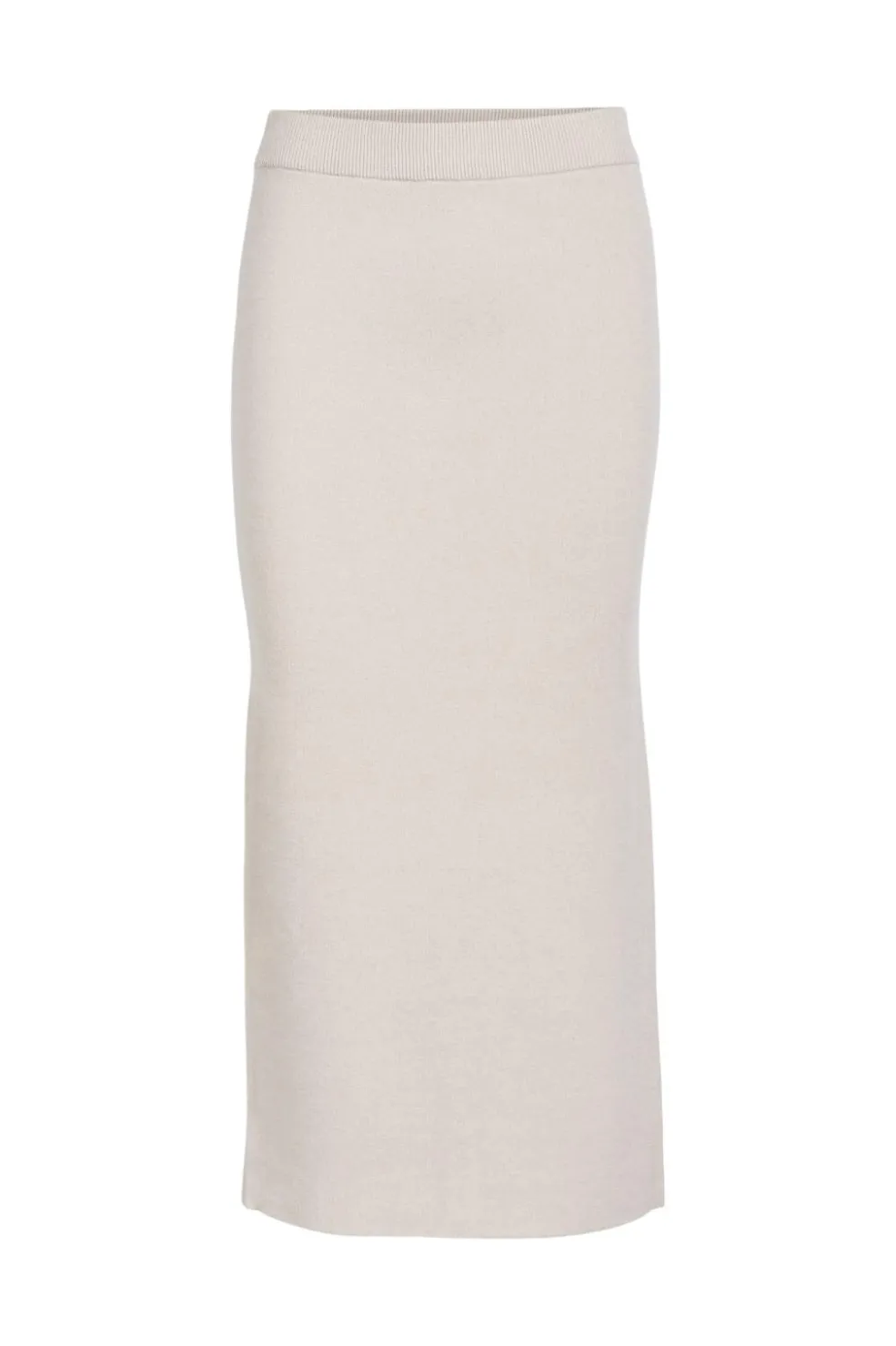 Strikket nederdel fra Object i lysegrå. Den har en høj talje og går ned til anklerne. Strikken med garnløkker giver en behagelig stræk-effekt.