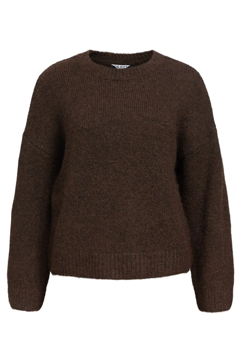 Brun strikpullover fra Object med løs pasform og rund halsudskæring. Den strikkede tekstur og melerede overflade giver pulloveren et rustikt udtryk.