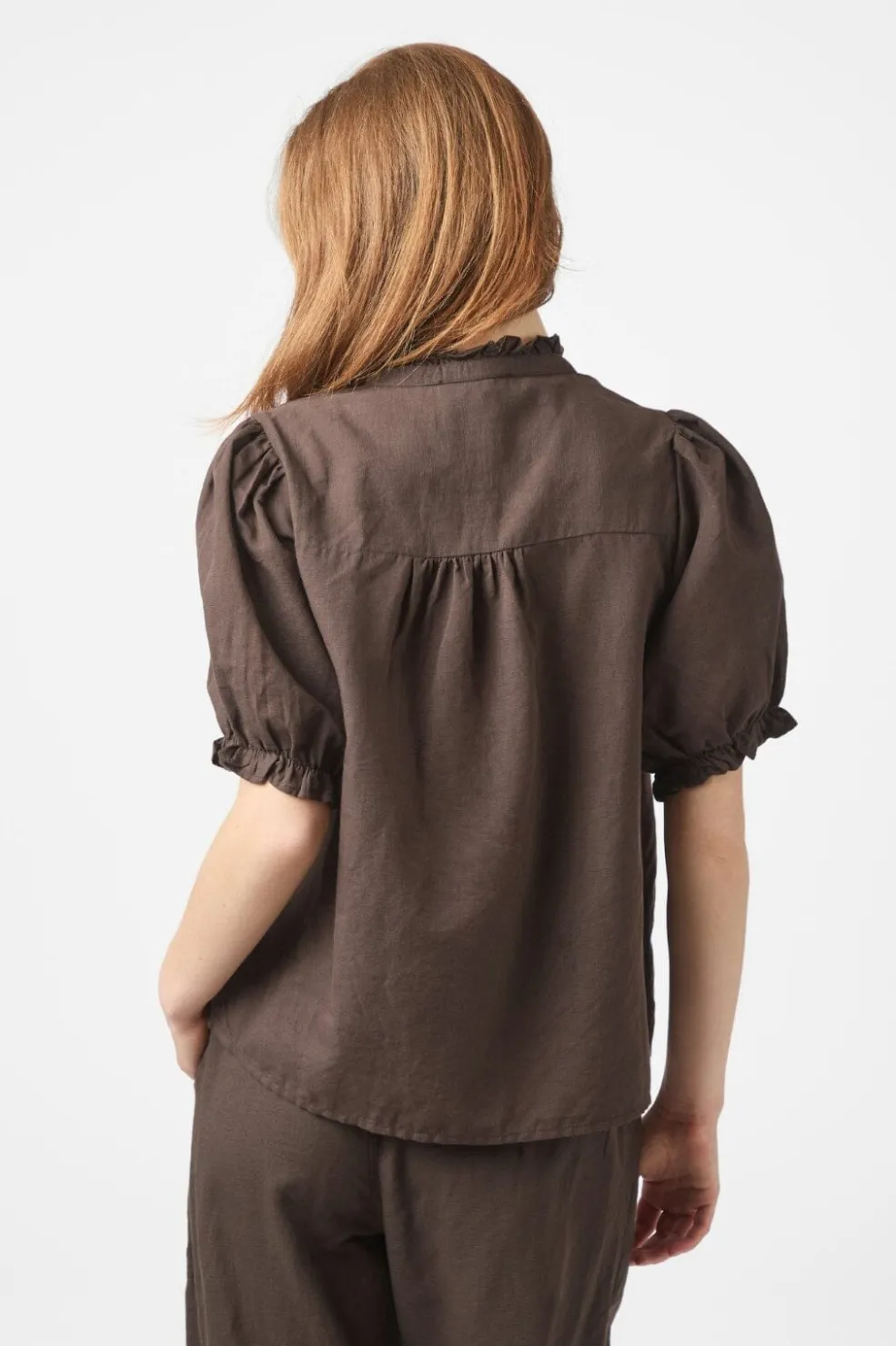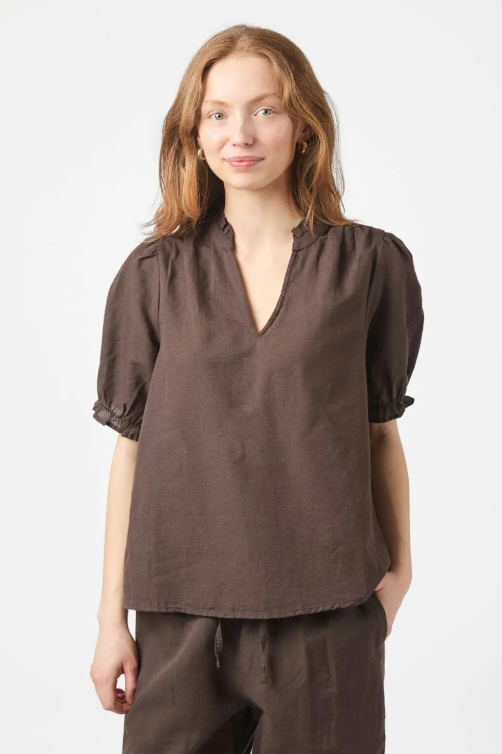 Mørkebrun hørbluse fra Neo Noir med V-udskæring. Blusen har flæsedetaljer ved kraven og korte pufærmer med samling ved håndleddene.