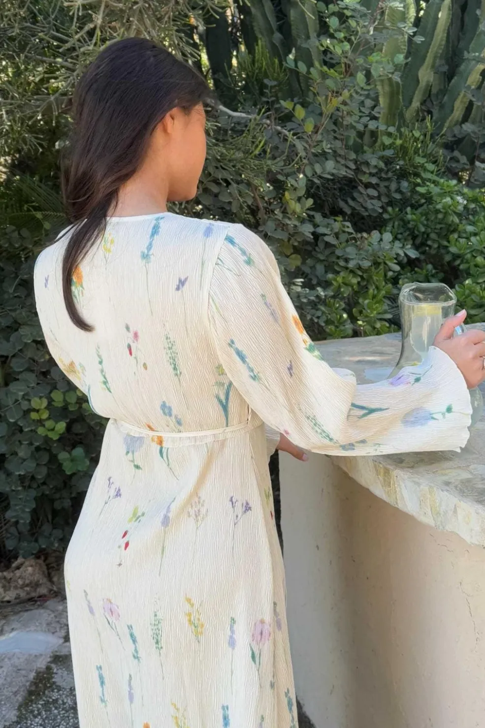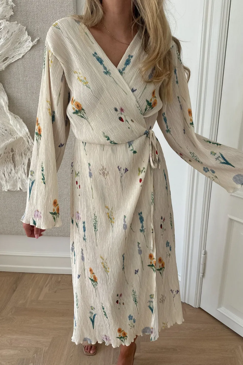 Lang slå-om-kjole fra BYIC med blomsterprint på hvid bund. Kjolen har V-udskæring, lange ærmer og bindebånd i siden med flæsedetaljer.