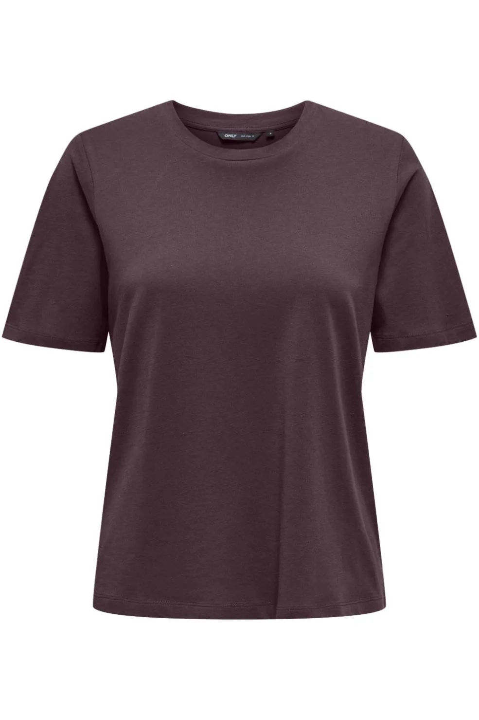T-shirt fra Only i en mørk vinrød farve. Den har en klassisk rund hals og korte ærmer med et rent og enkelt design.