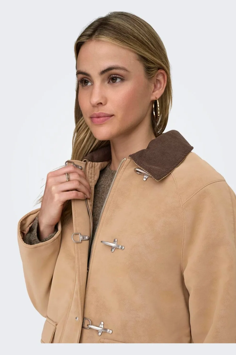 Ruskindsjakke fra Only i en varm beige-brun nuance. Jakken er lavet af genanvendt polyester med polyurethanbelægning og har en kontrastkrave i mørkere brun.