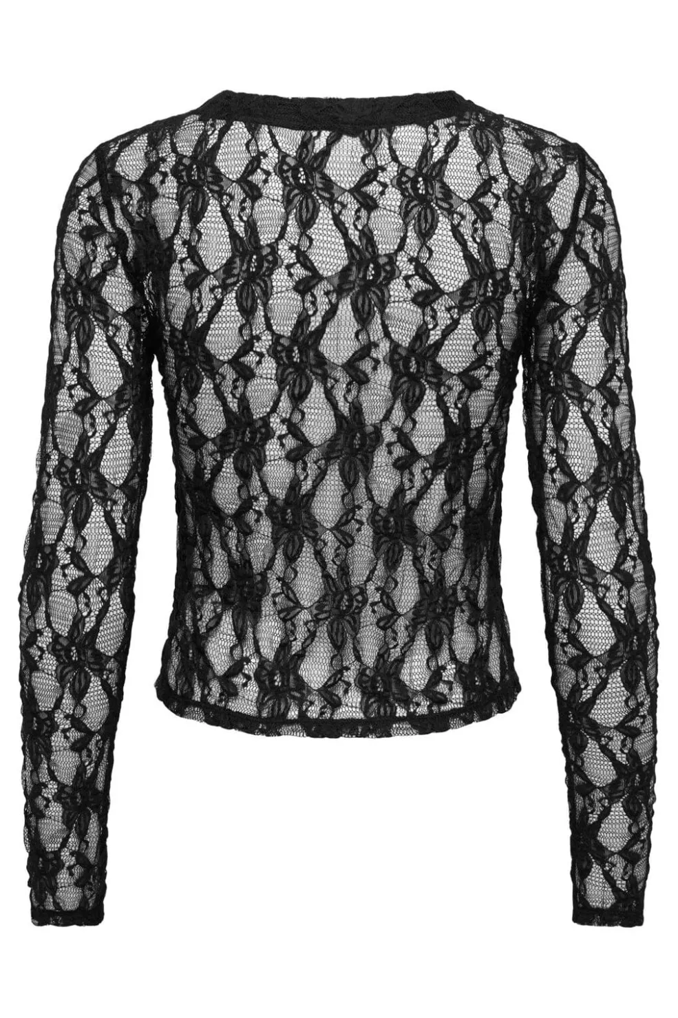 Sort blondetop fra Only med V-hals og lange ærmer. Toppen har et blomstermønster i blonden og perleknapper langs midten.