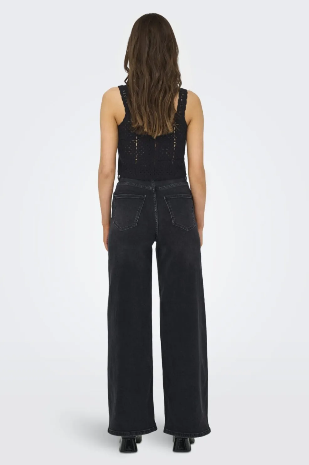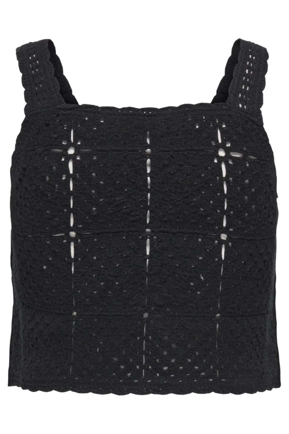 Sort top fra Only med bølgede stropper og blondemønster. Toppen har knapper foran og dekorative syninger, der skaber et fint mønster i stoffet.