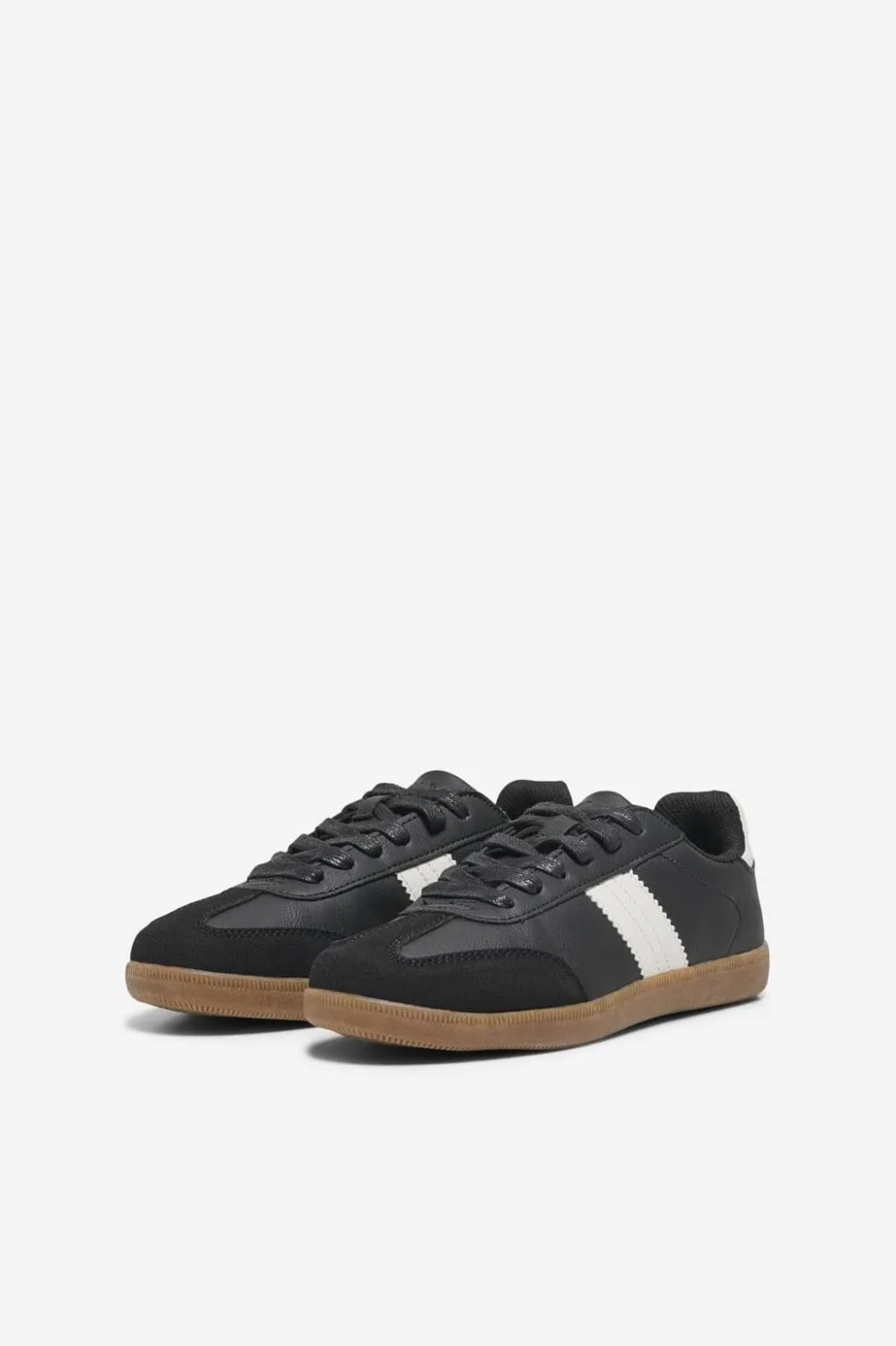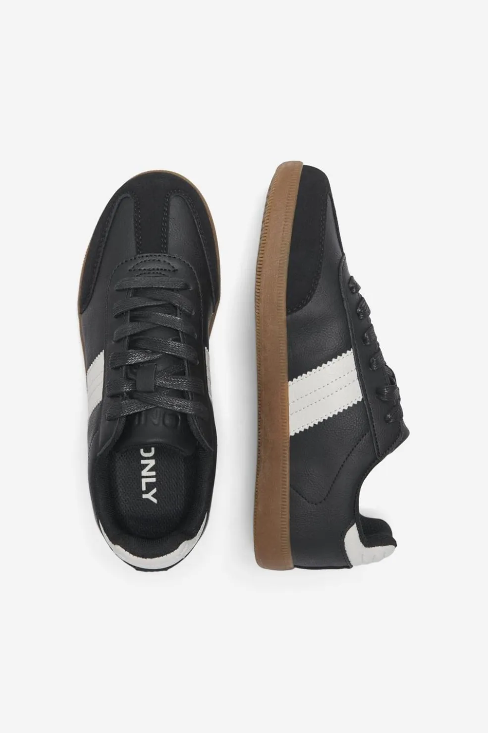 Sort sneaker fra Only Shoes med hvide striber og snørebånd. Skoen har en korksål, der tilpasser sig fodens form og giver god stødabsorbering.
