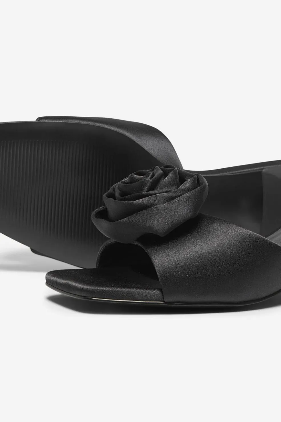 Sorte heeled mules fra Only Shoes med en dekorativ roset på remmen. Skoene har en stilettohælt og en firkantet sål.