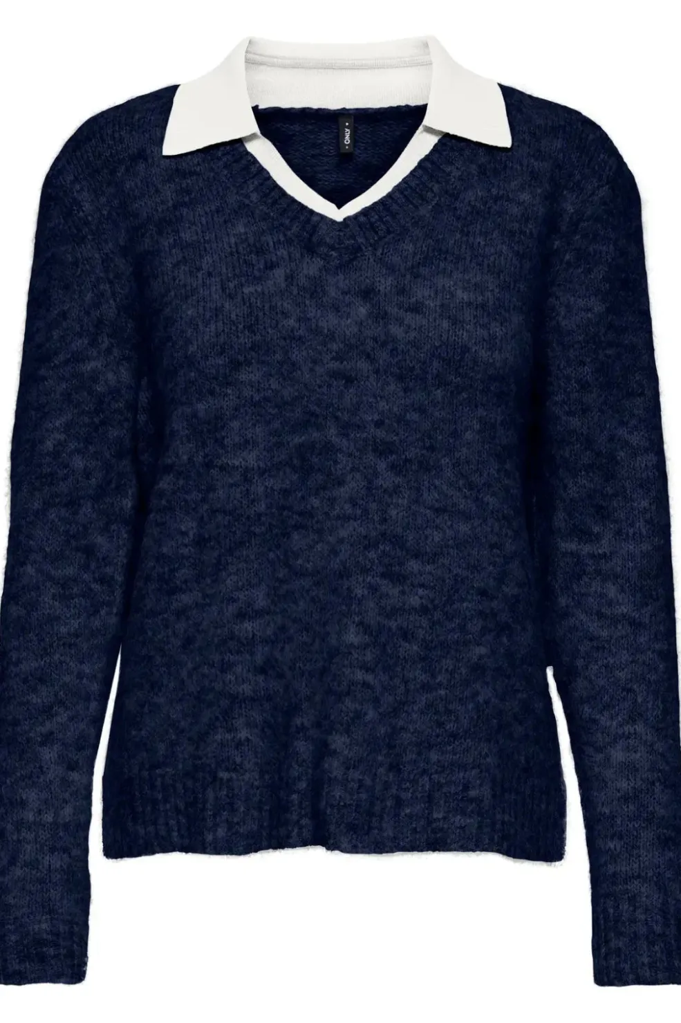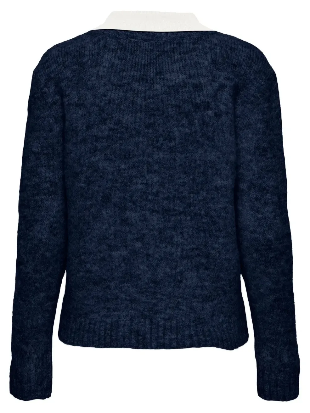 Mørkeblå meleret striktrøje fra Only med en kontrastfarvet hvid polokrave. Trøjen er en pullover i fladstrik med lange ærmer og en løs pasform.