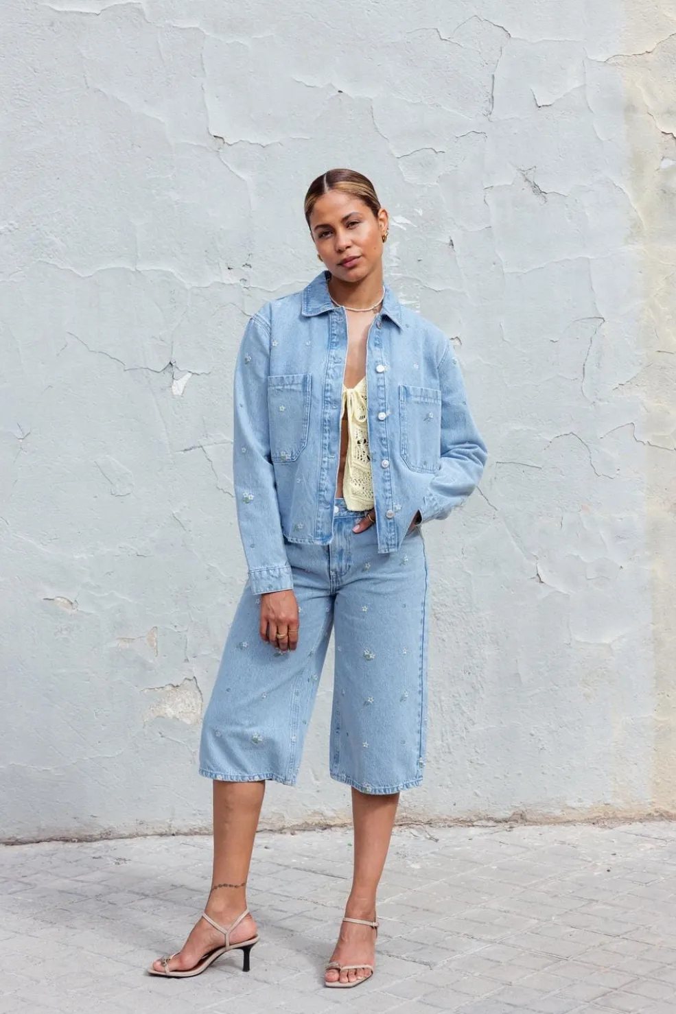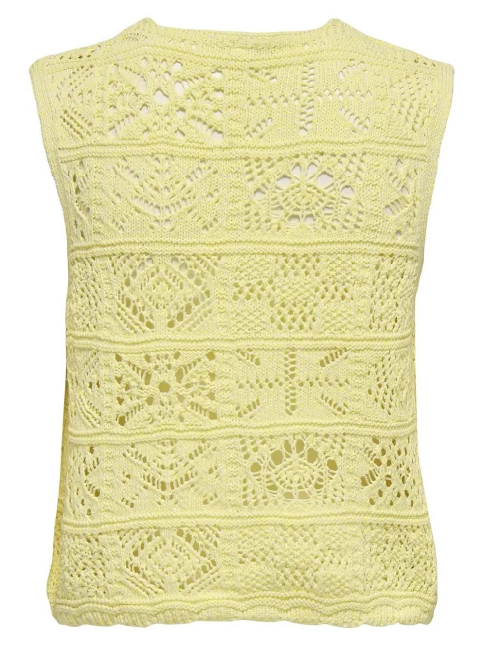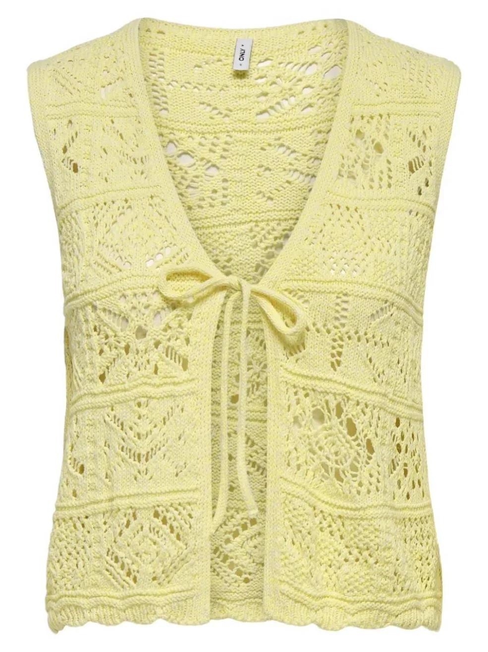 Strikket vest fra Only i en lys gul farve. Den har hæklede detaljer, V-halsudskæring og bindebånd foran. Det ærmeløse design giver vesten et let og luftigt udtryk.