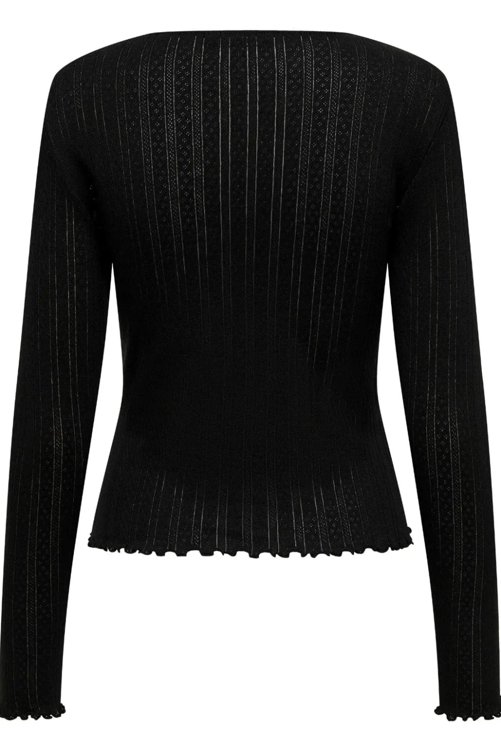 Sort top fra Only med lange ærmer og ribbet design. Toppen har lodrette striber og en rund halsudskæring med scallop-kant og flæser, der giver et feminint præg.