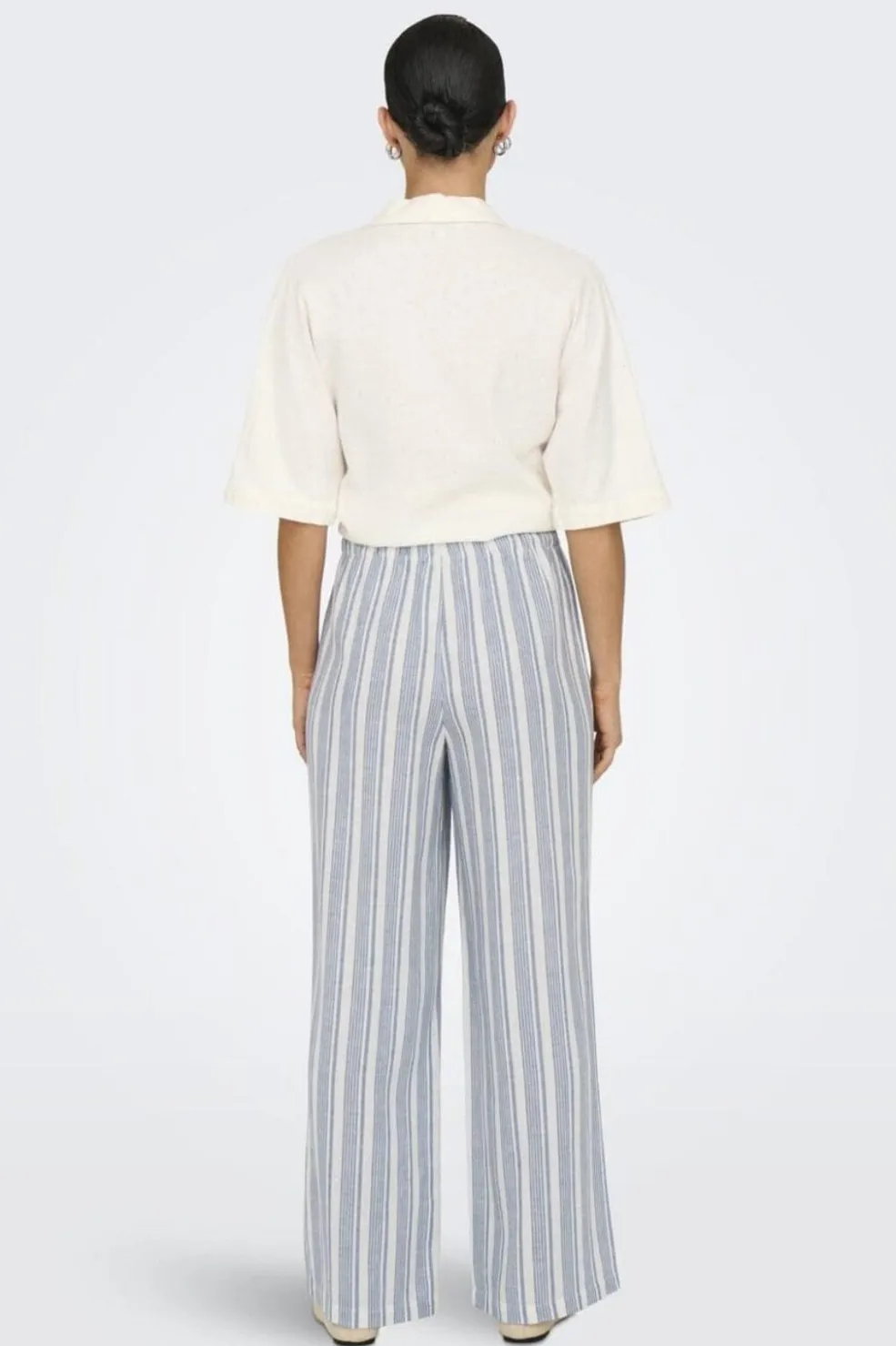 Stribede bukser fra Only i lyseblå og hvid. De har en løs pasform og lang længde med et maritimt inspireret mønster. Bukserne kommer med bindebånd i taljen.