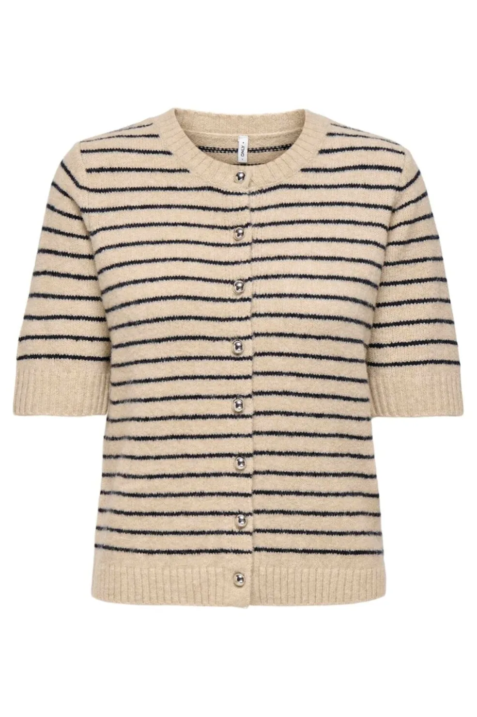 En stribet cardigan fra Only med korte ærmer og rund hals. Cardiganen har mørkeblå striber på en lys beige baggrund og sølvknapper langs fronten.