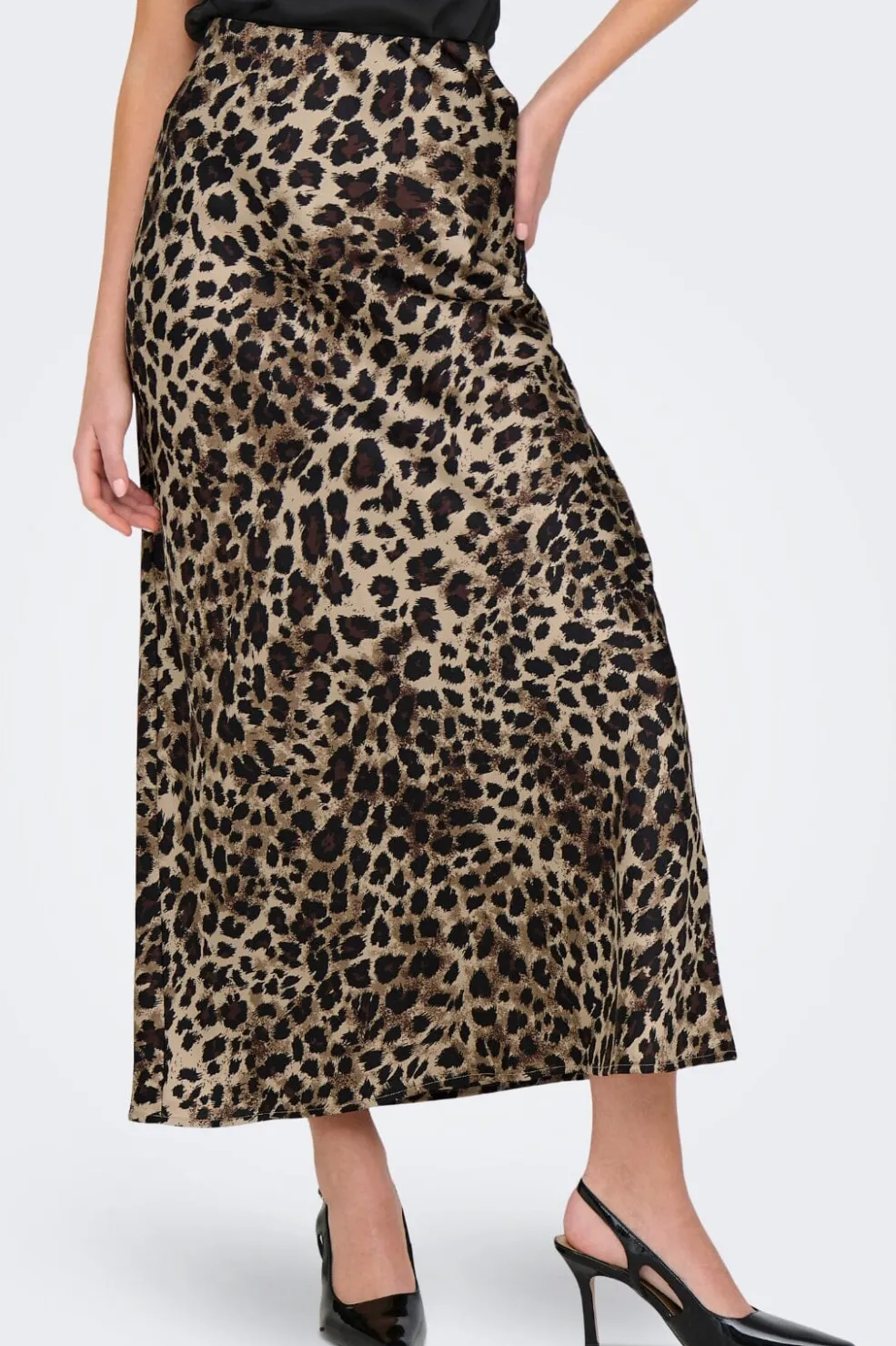 Satinnederdel fra Only med leopardmønster i beige nuancer. Det blanke satinmateriale har en glat overflade, og nederdelen går til anklerne med en lige pasform.
