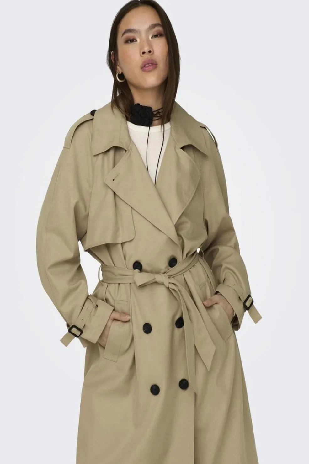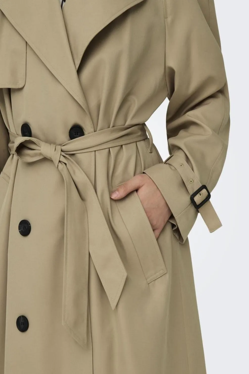 Beige trenchcoat med revers og dobbeltknaplukning fra Only. Den lange frakke har et klassisk snit med brede revers og et matchende bælte.