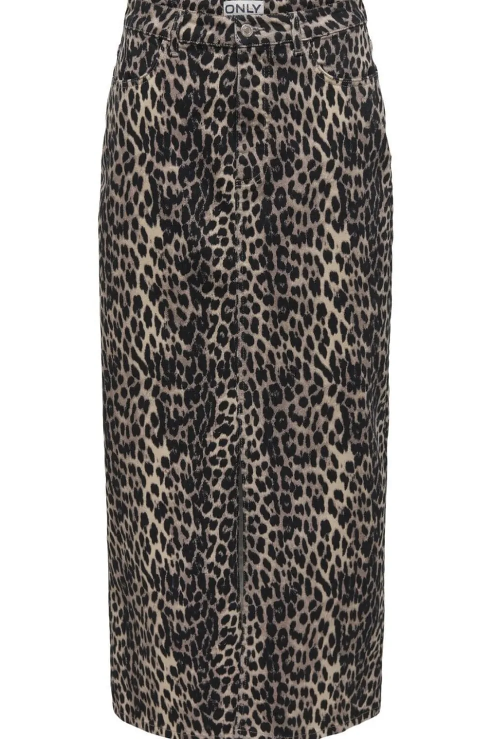 Lang nederdel fra Only med sort og beige leopardmønster. Nederdelen har en slids foran og normal taljehøjde med knap- og lynlåslukning.