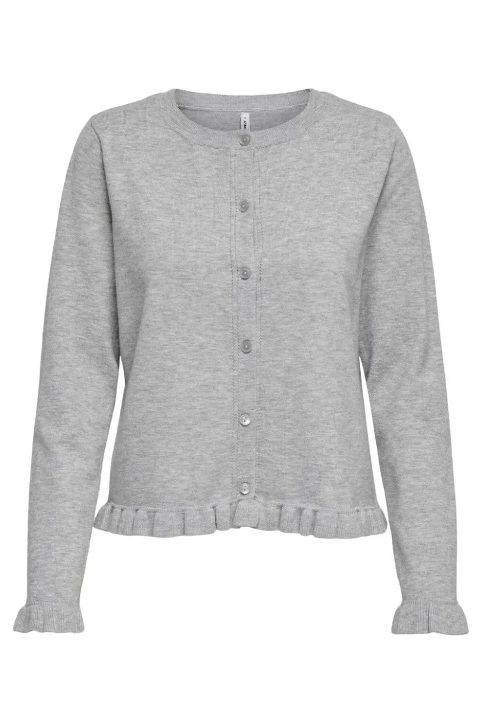 Lysegrå cardigan fra Only med rund hals og lange ærmer. Cardiganen har flæsedetaljer ved manchetterne og kanten samt knaplukning foran.