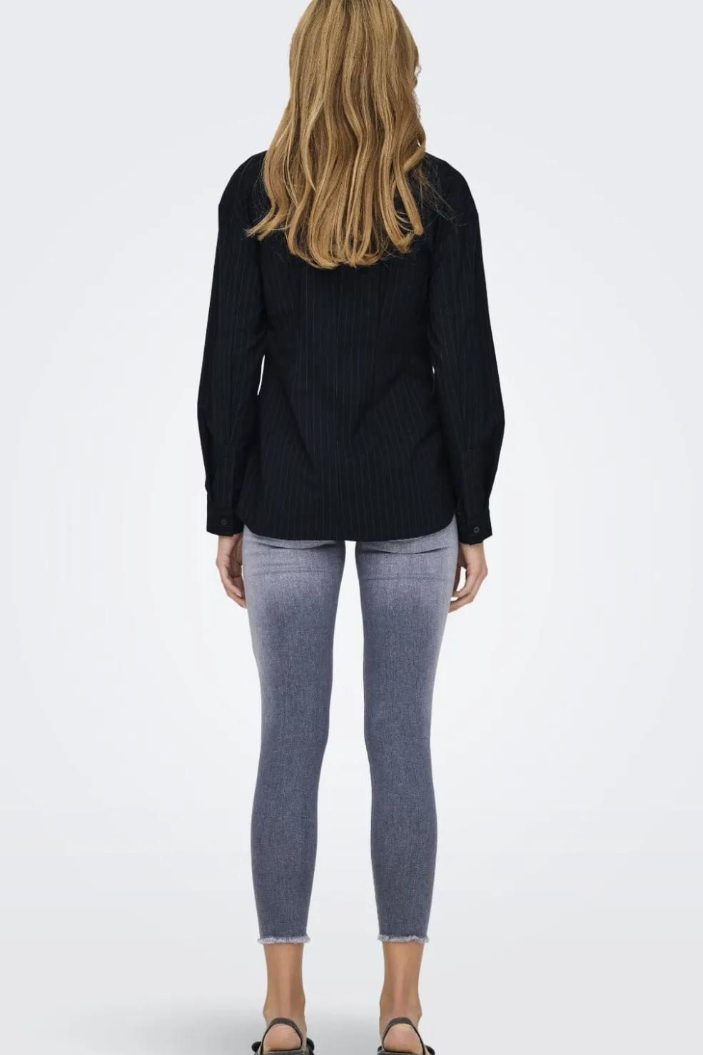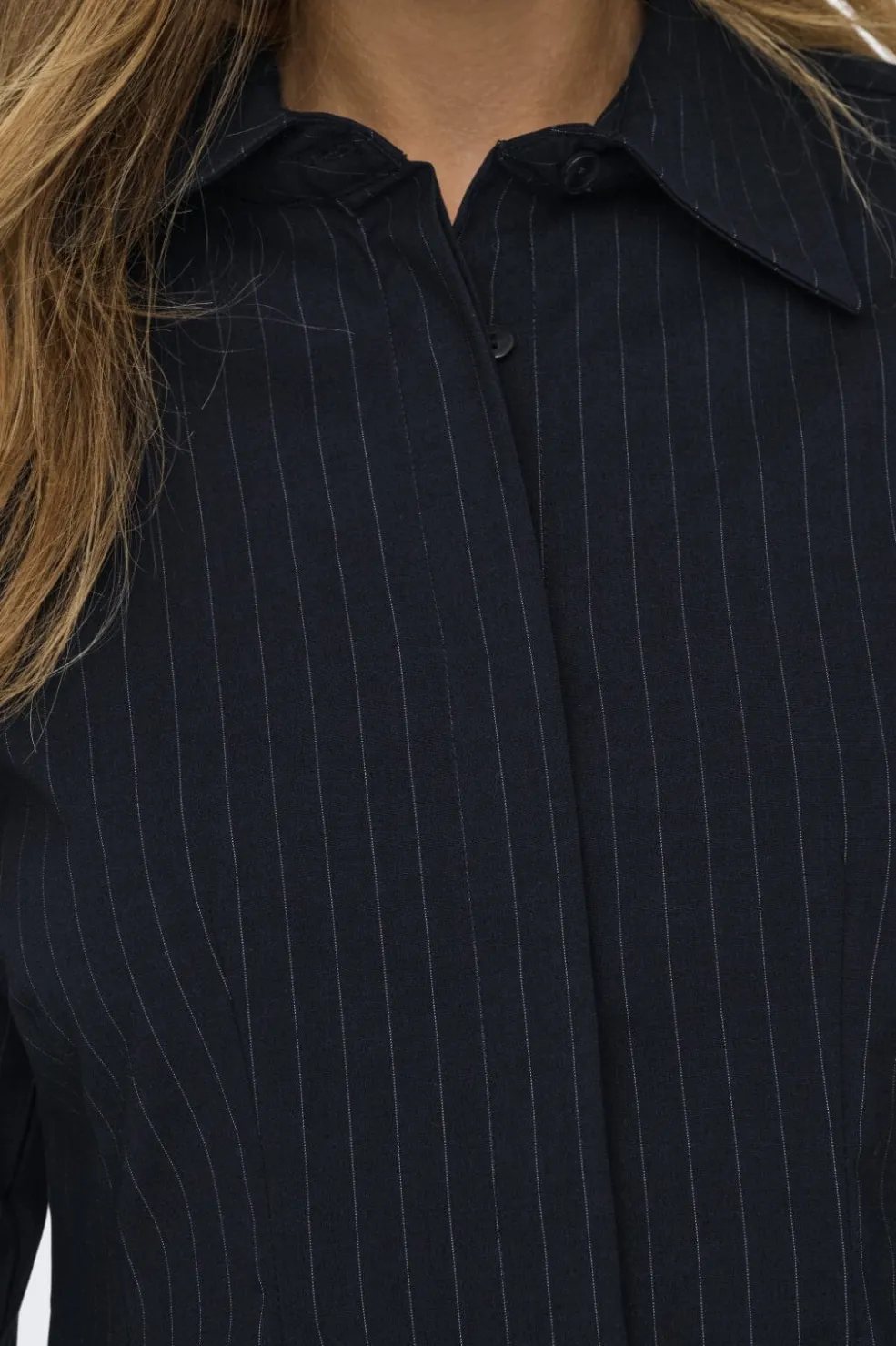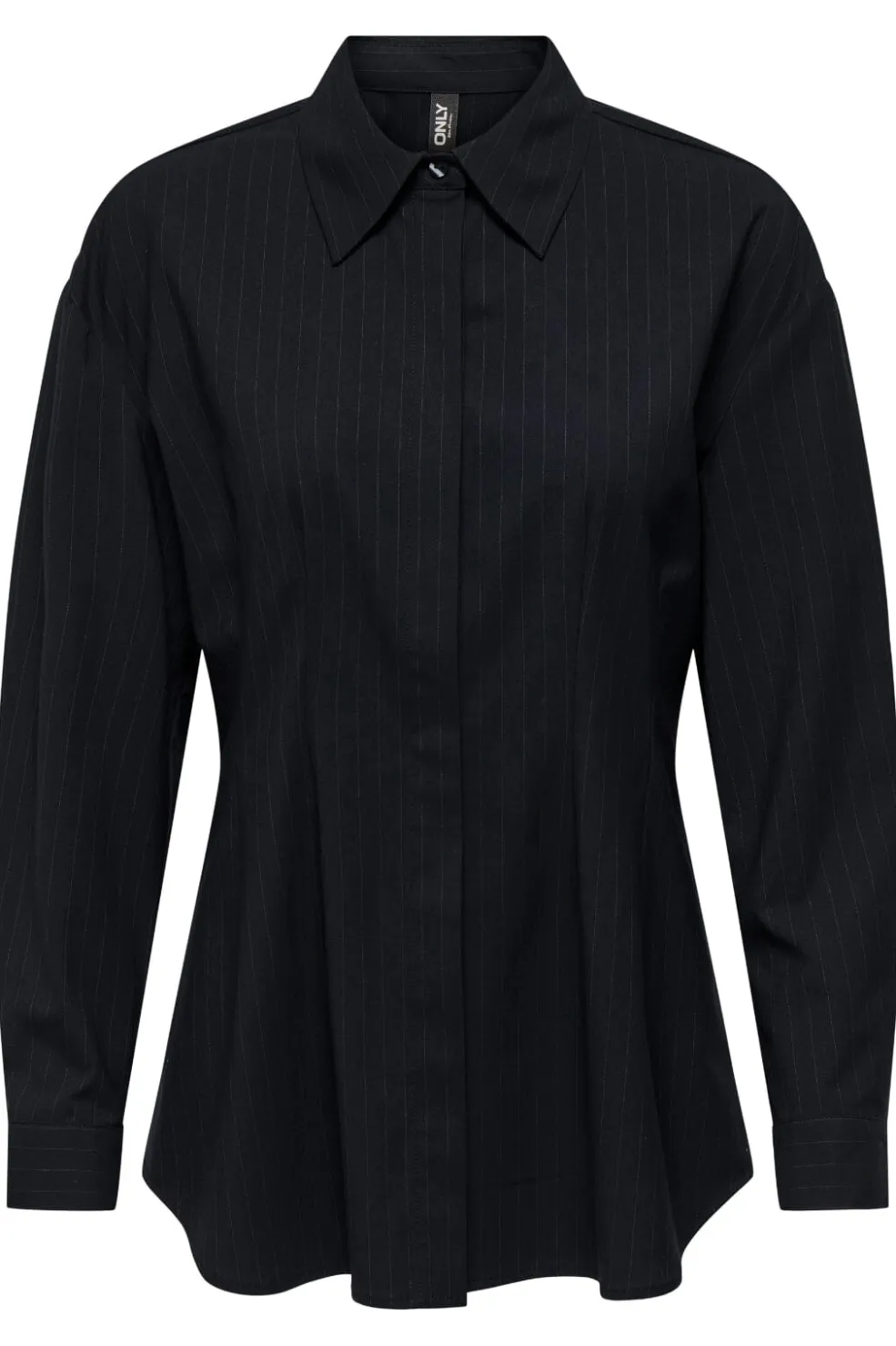 Sort skjorte fra Only med hvide nålestriber. Skjorten har en slim fit-pasform og klassisk skjortekrave. Den fungerer både til formelle og afslappede anledninger.