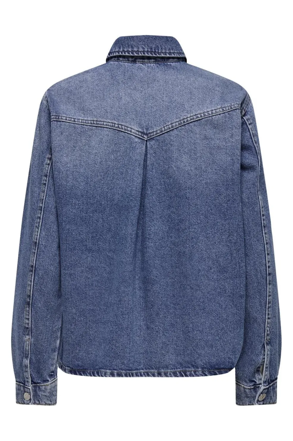Denimskjorte fra Only i medium blå denim. Skjorten har skjortekrave, lange ærmer med knaplukkede manchetter og brystlommer. Knapper hele vejen ned foran.